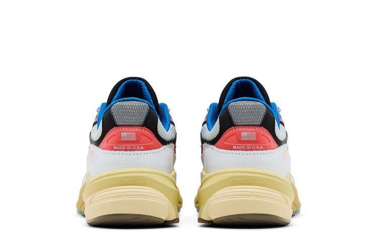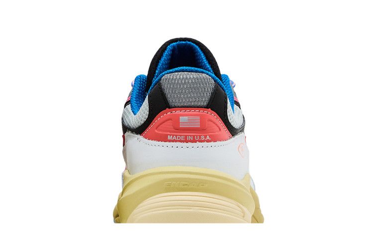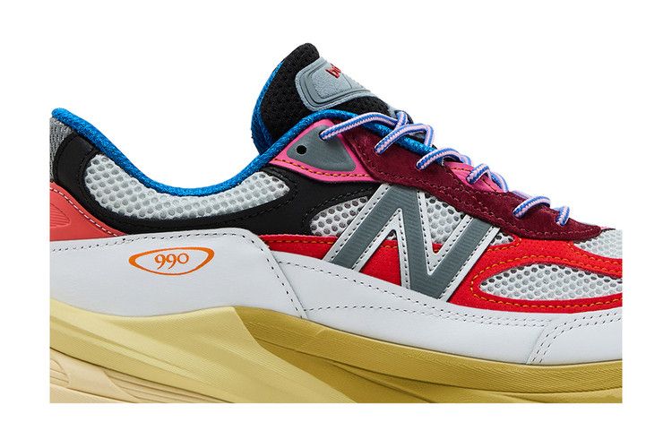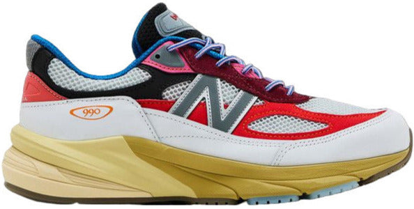 The Action Bronson x New Balance 990v6 Made in USA 'Untitled' features an off-white mesh upper with a white leather mudguard, marked with 990 branding on the lateral heel. Contrasting pops of color arrive via a blue mesh collar lining, a burgundy and fuchsia eyestay, and synthetic nubuck midfoot overlays in scarlet and black. Offsetting the vibrant palette up top is a bulky ENCAP midsole in neutral khaki and cream tones.