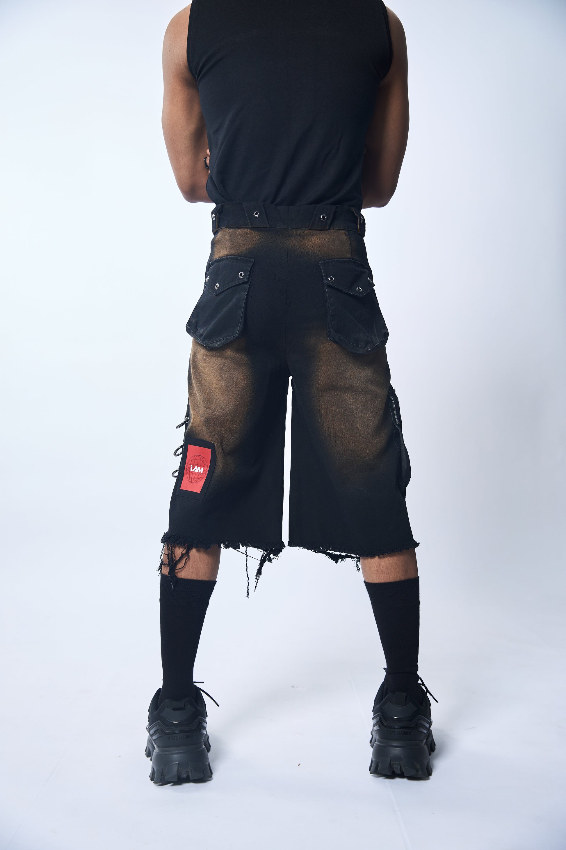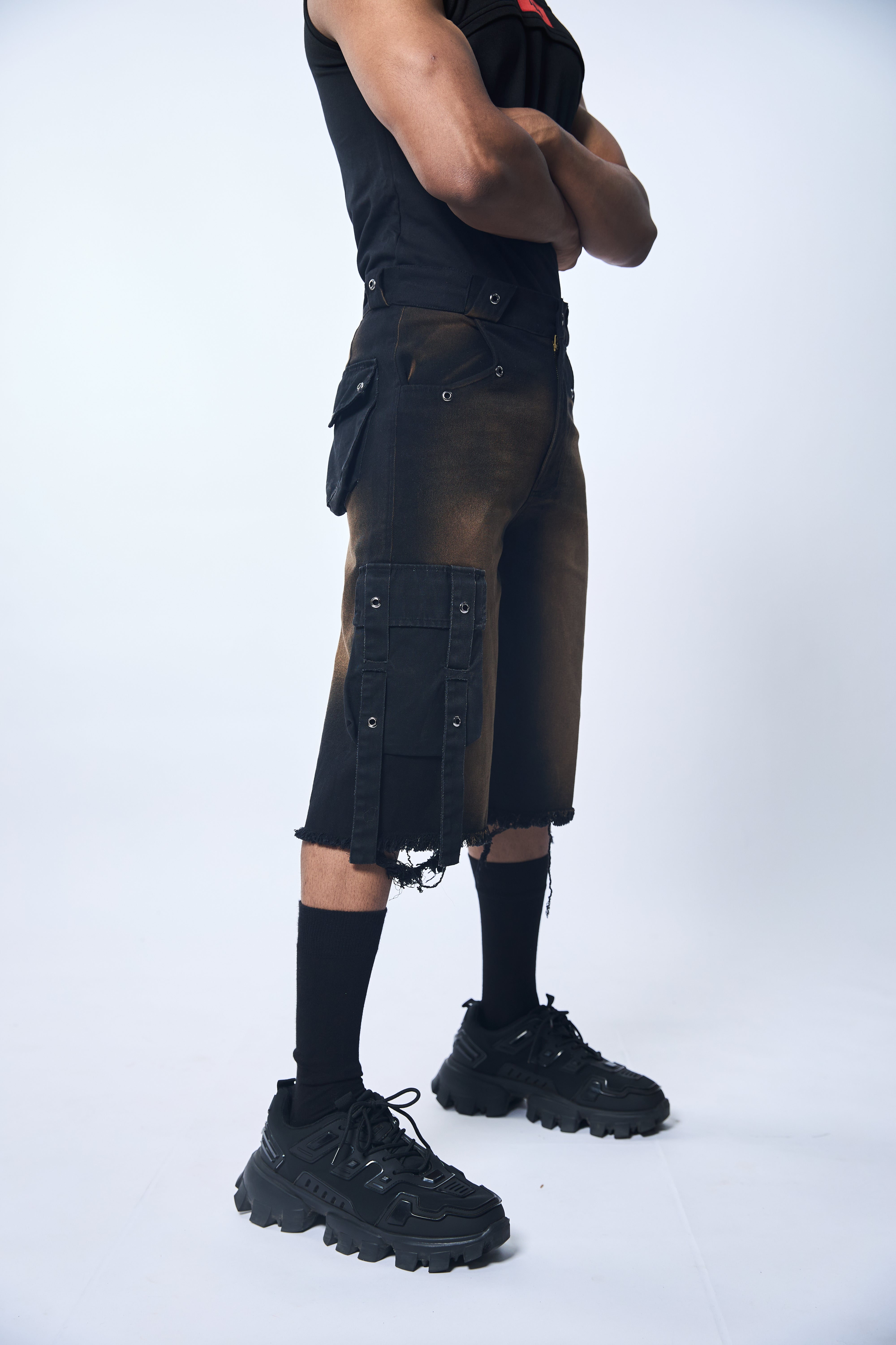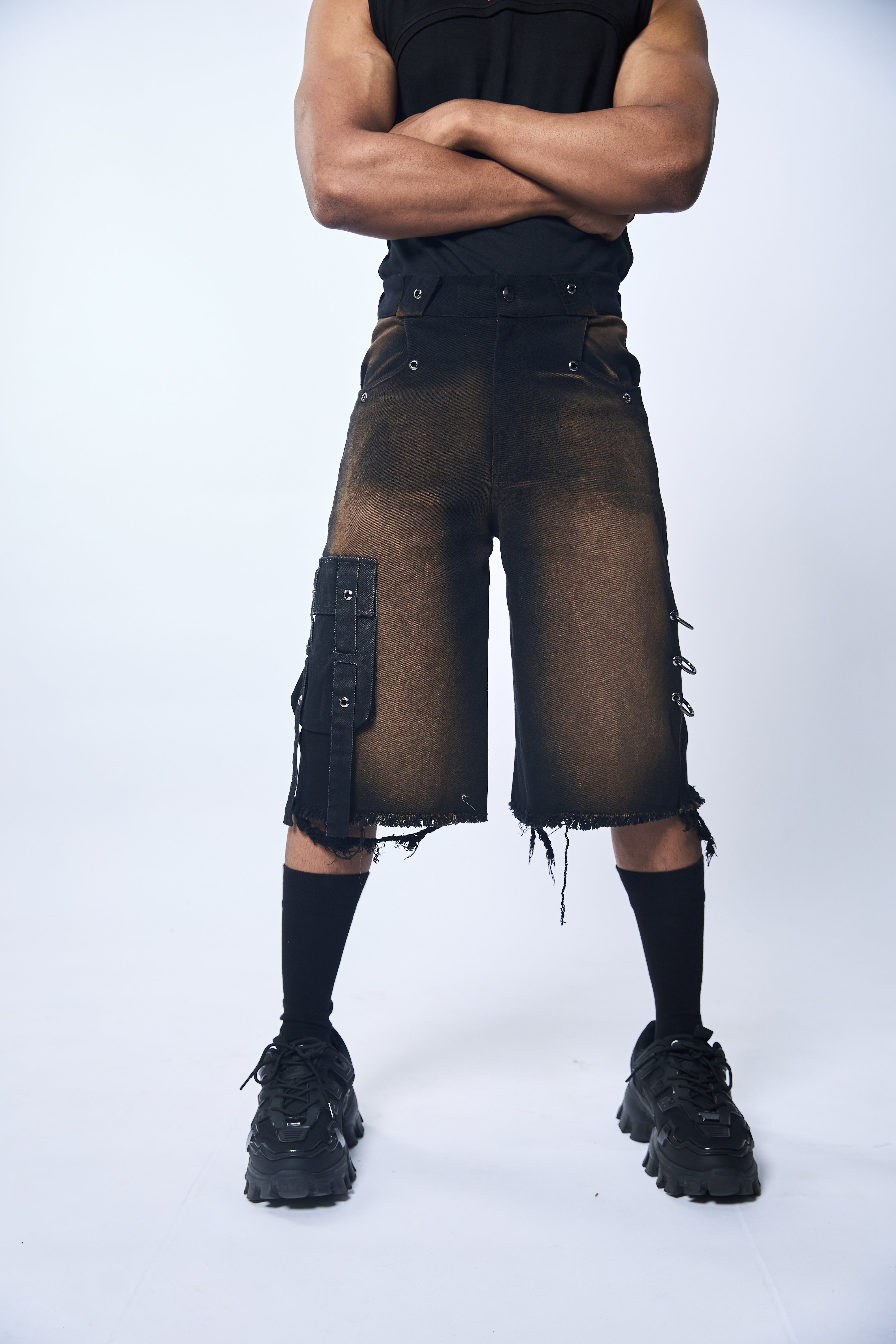 Make a bold statement with our Black Denim Shorts. These knee-length shorts feature unique bleach accents on the front and back, tinted with an orange shade for a standout look. The distressed bottoms add an edgy touch, perfect for a casual yet stylish appearance.