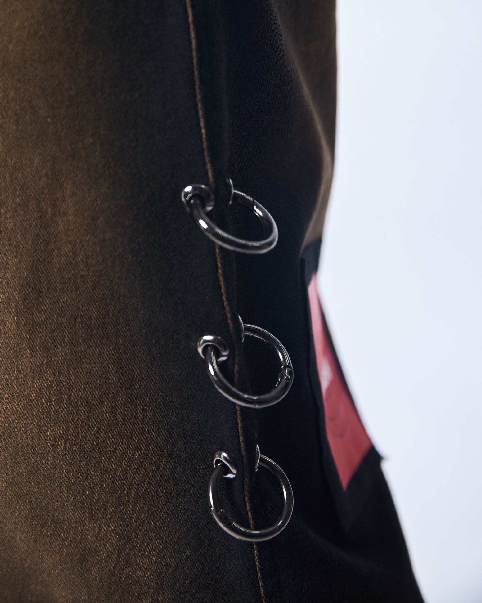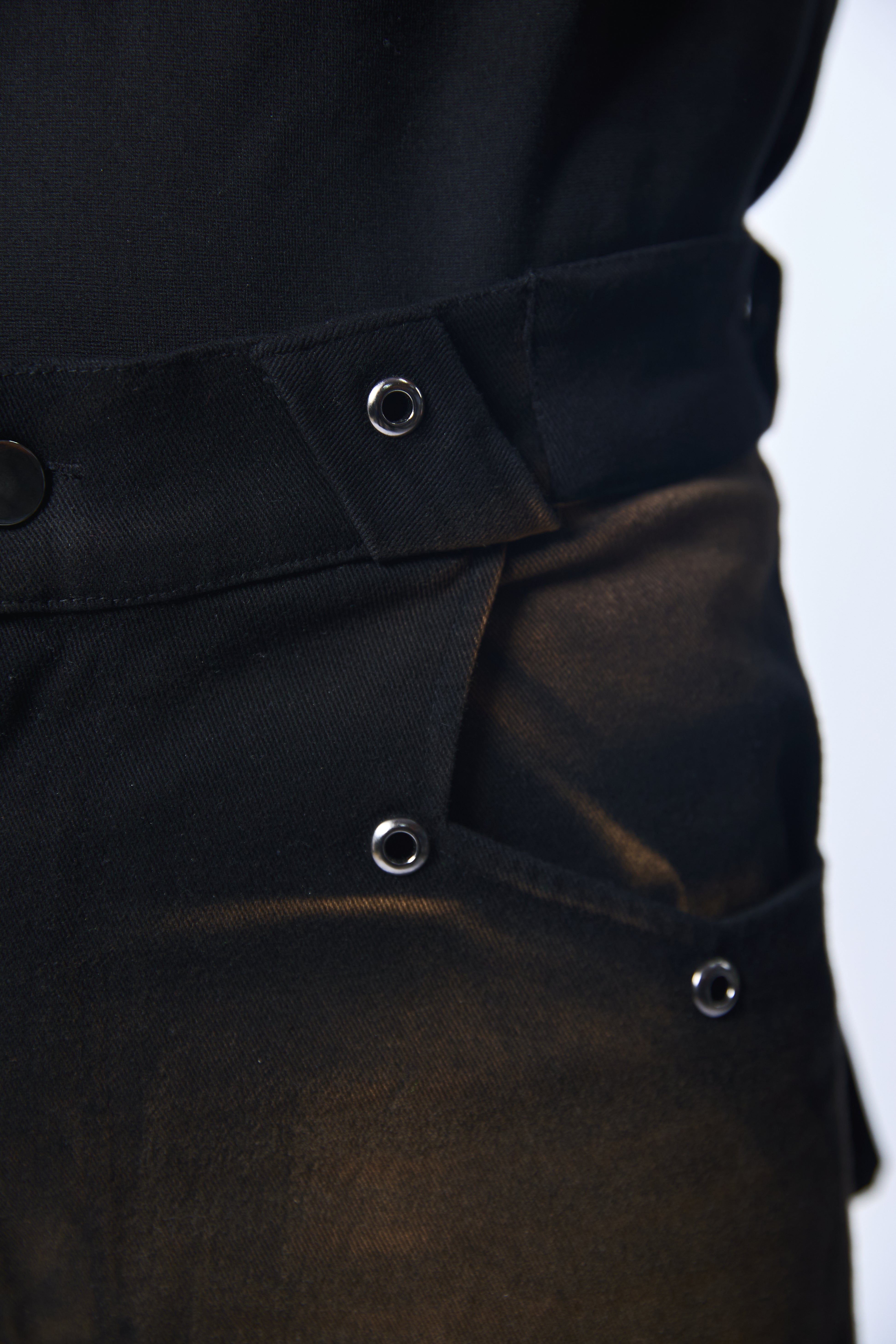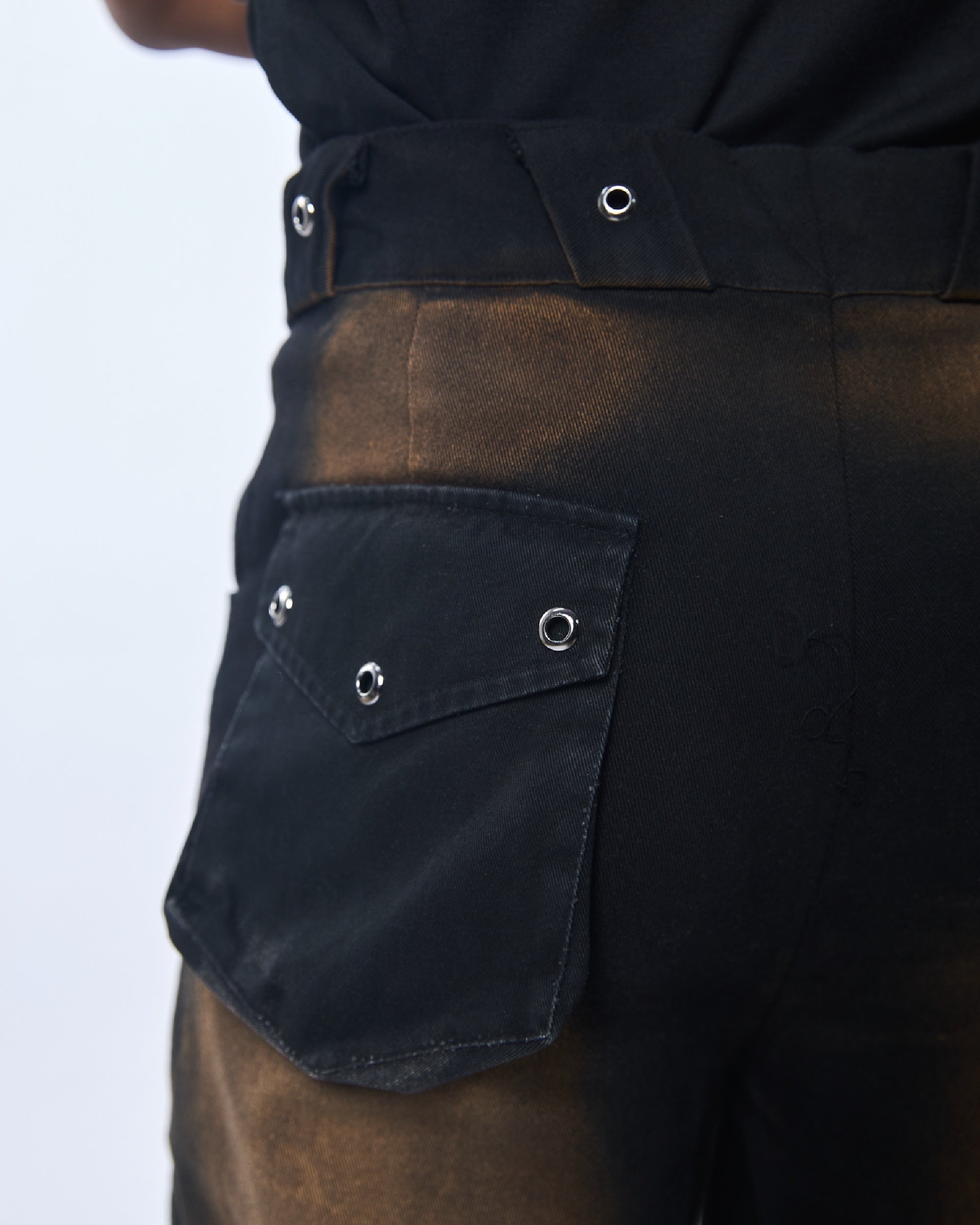 Make a bold statement with our Black Denim Shorts. These knee-length shorts feature unique bleach accents on the front and back, tinted with an orange shade for a standout look. The distressed bottoms add an edgy touch, perfect for a casual yet stylish appearance.