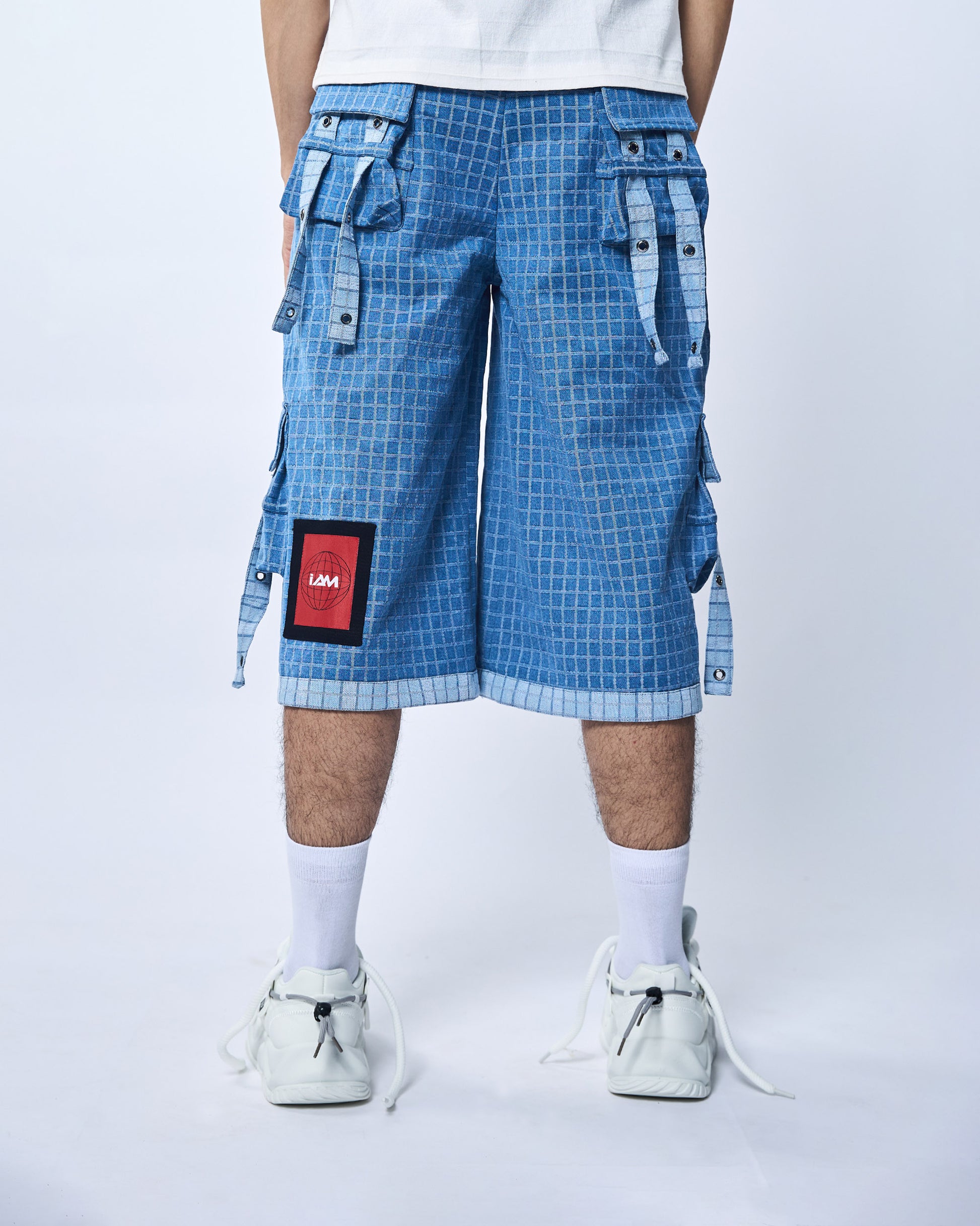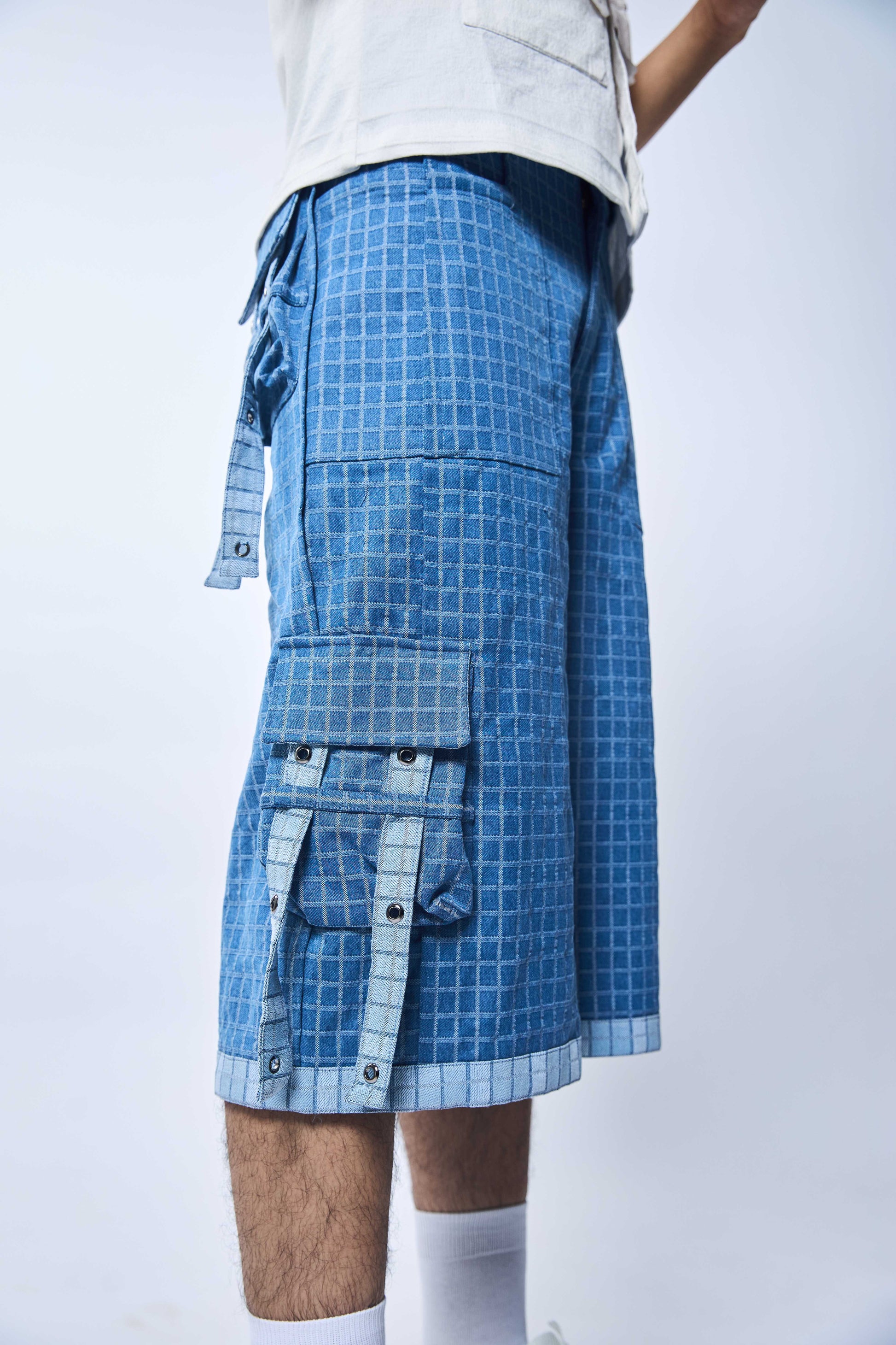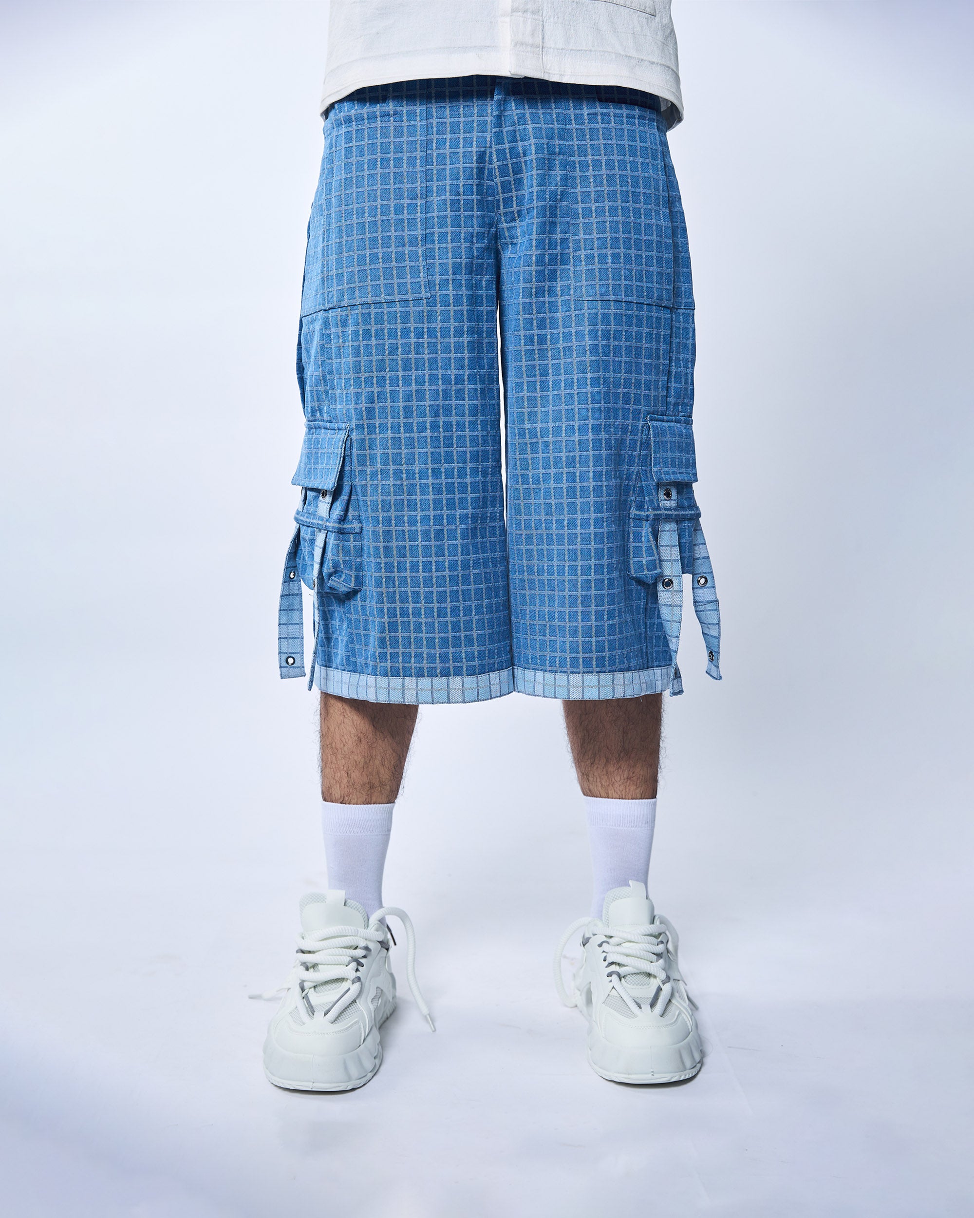 Stand out in our Blue Denim Shorts featuring big check-patterned pockets extending to the knees. These stylish shorts come with hanging straps and silver eyelets, adding a unique edge to your look. Perfect for casual wear with a trendy twist.