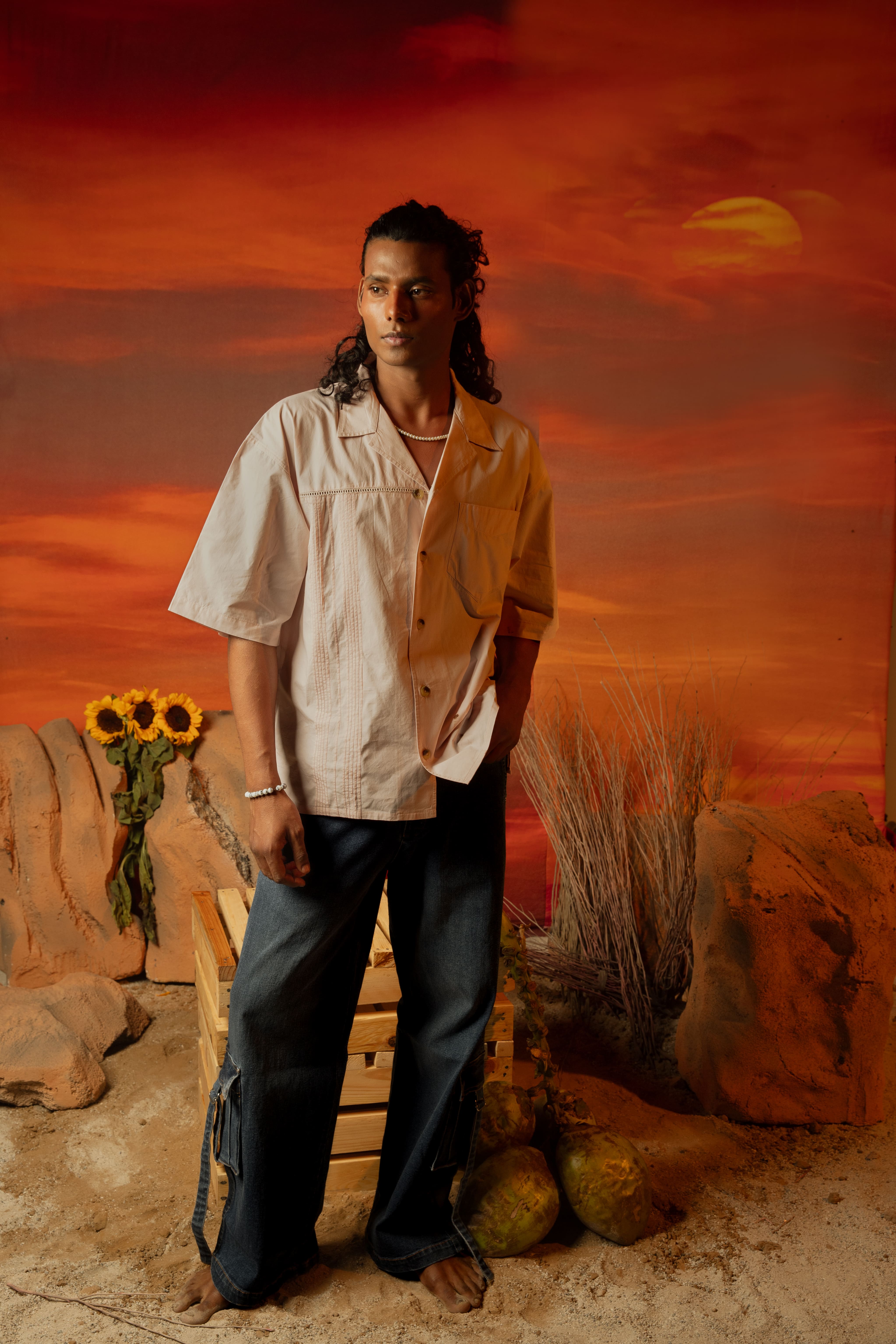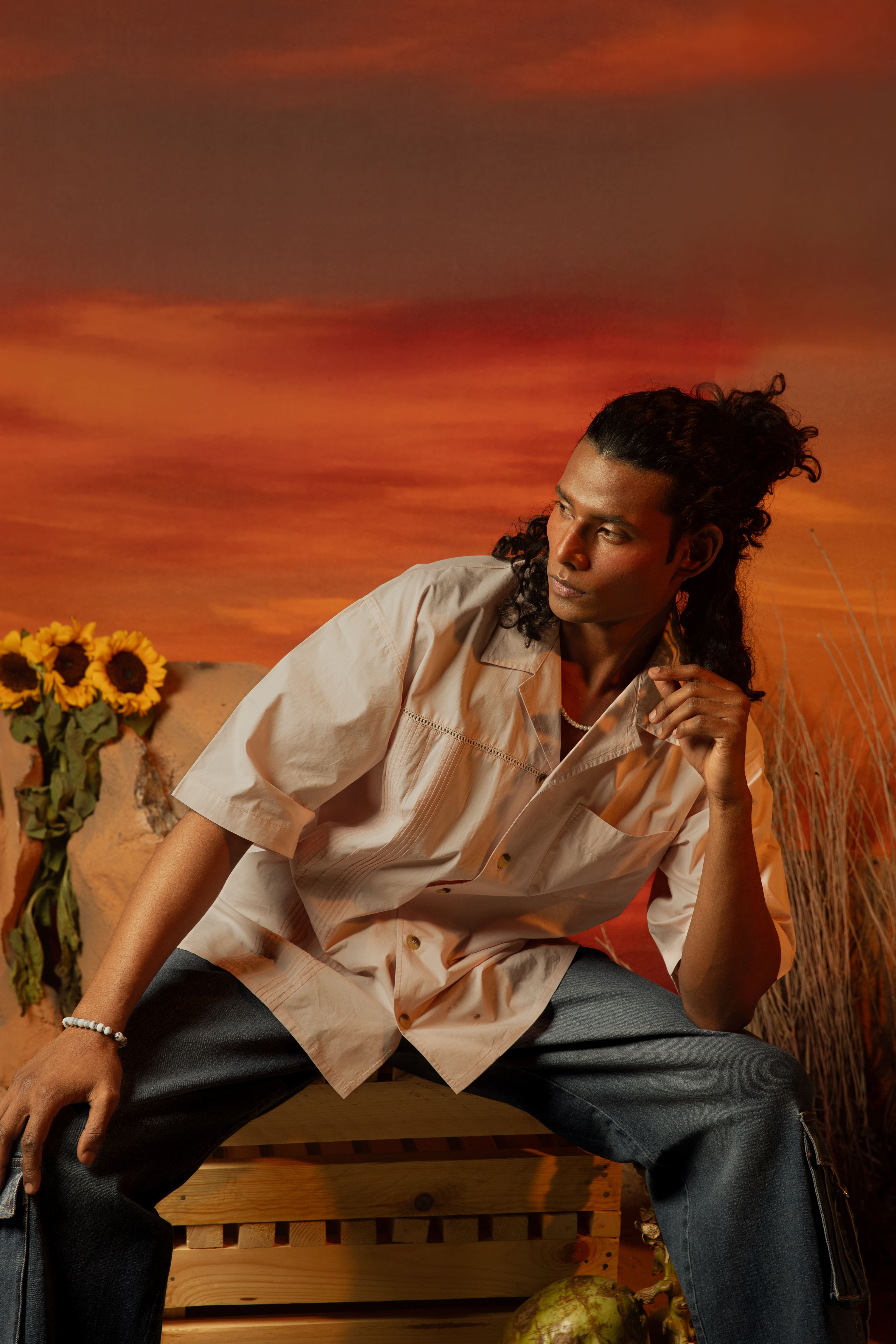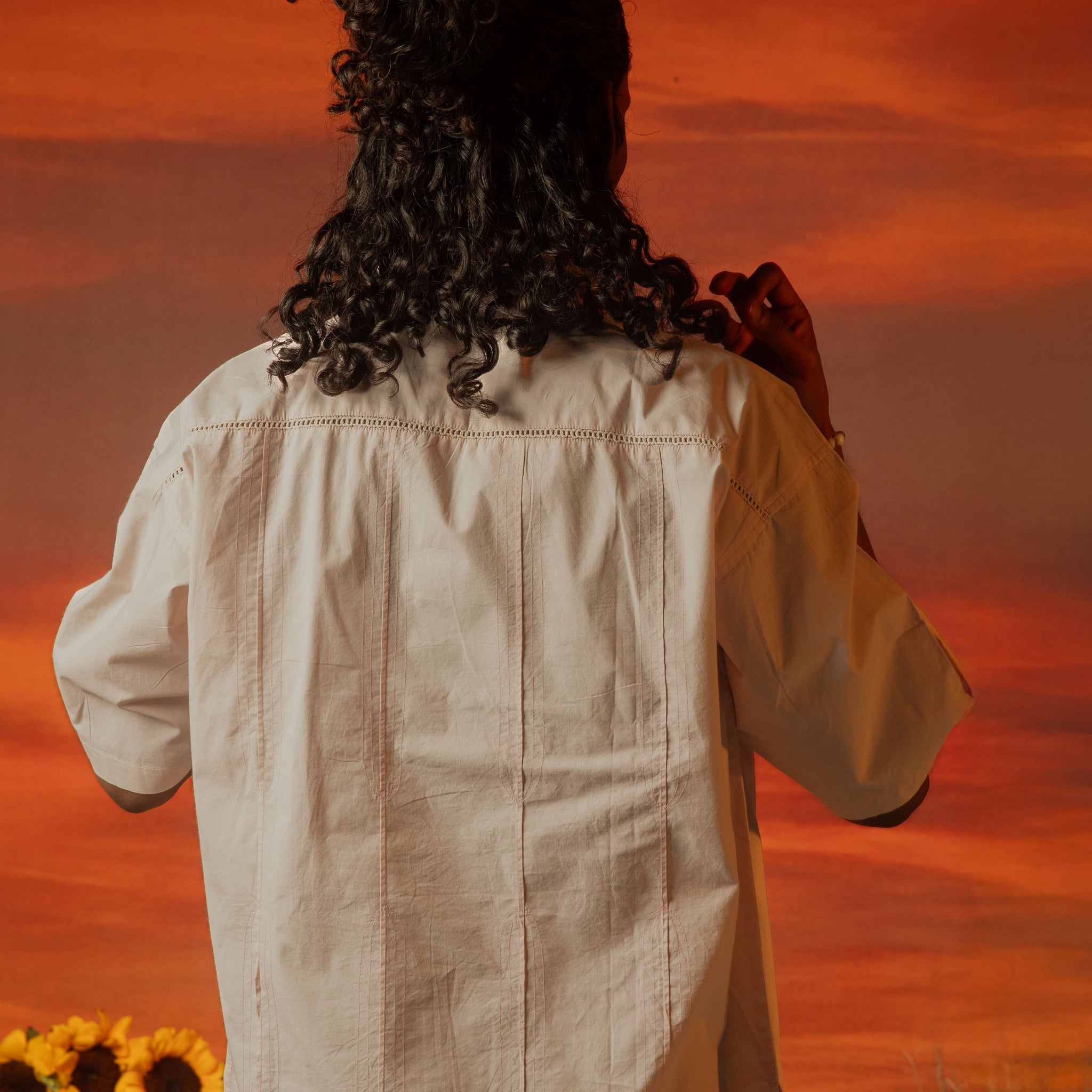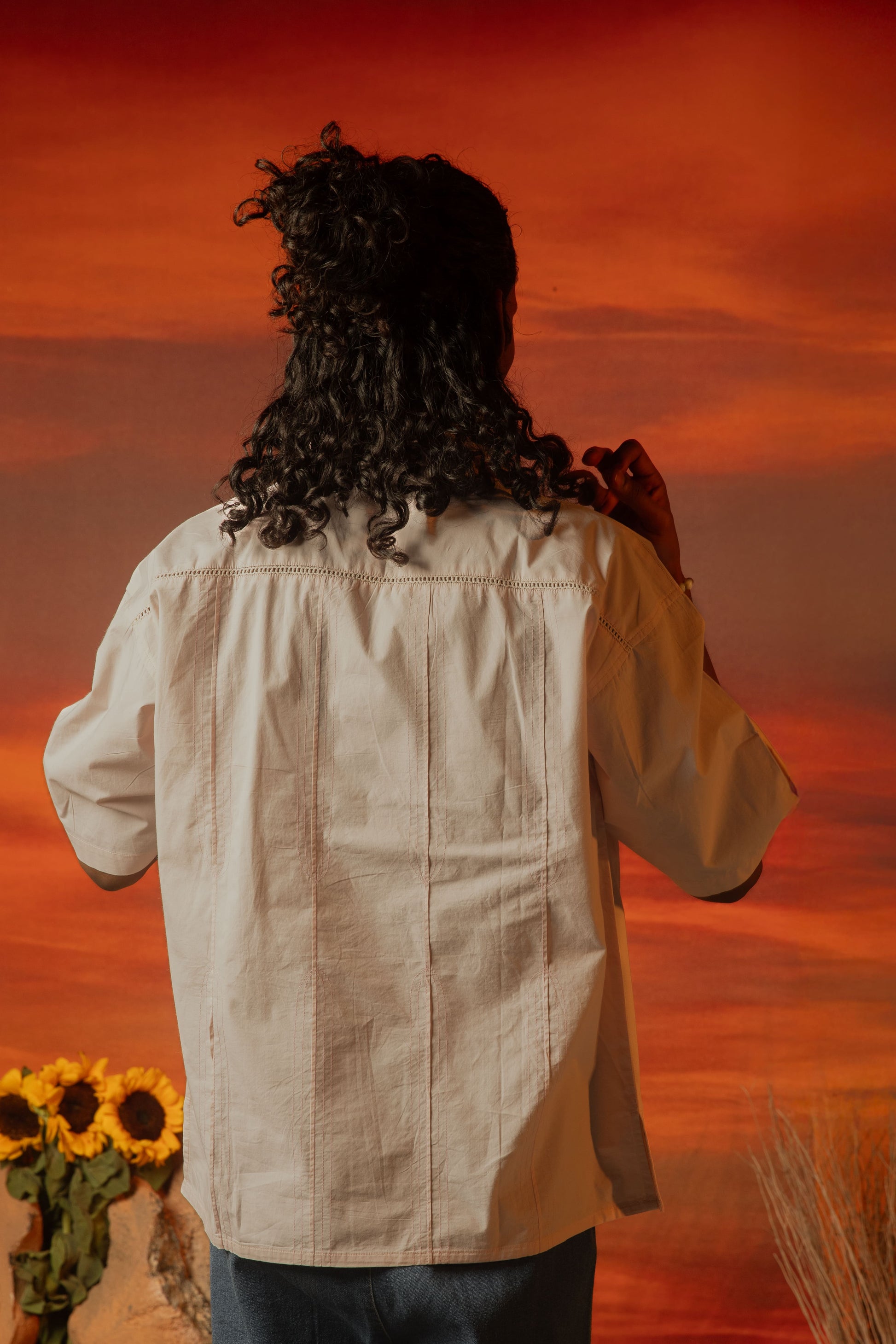 This oversized pleated shirt is made from soft cotton, designed to hold volume without weight. The pleats give it form, the lace work breathes life into it—breaking up the fabric with light, line, and subtle contrast.