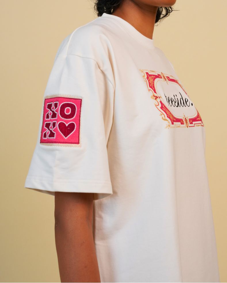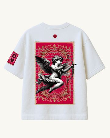 A bold expression of contrast and craftsmanship, this T-shirt fuses mythological symbolism with streetwear precision. On the back, a striking Cupid graphic — not your typical cherub but a modern icon of love and defiance — dominates the canvas. The front carries a clean design detail while the shoulder features a finely embroidered patch, elevating the piece with artisanal texture.