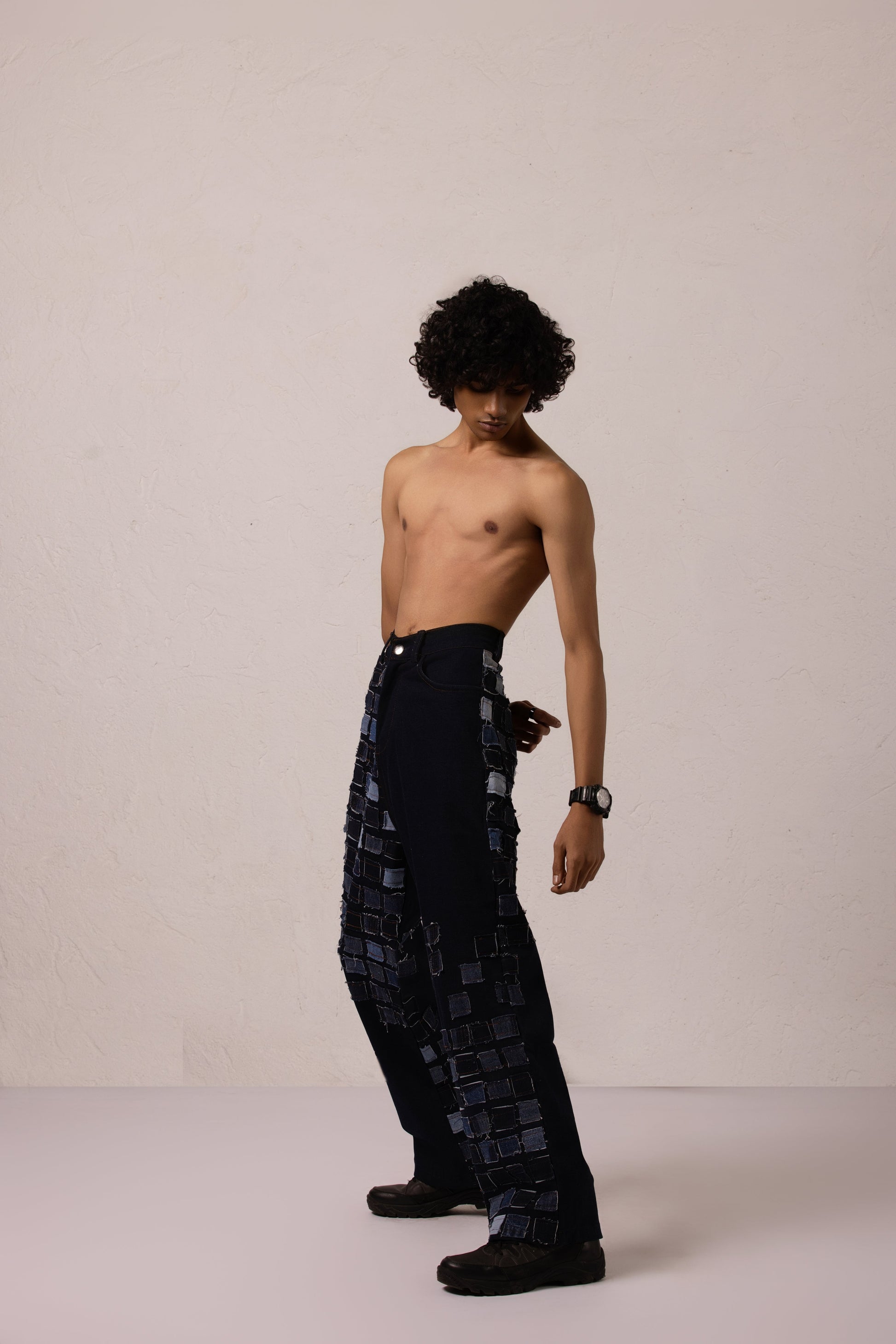 This denim features a cascade of meticulously sewn tiny patches, creating a bold, diagonal flow that adds character to every step.
