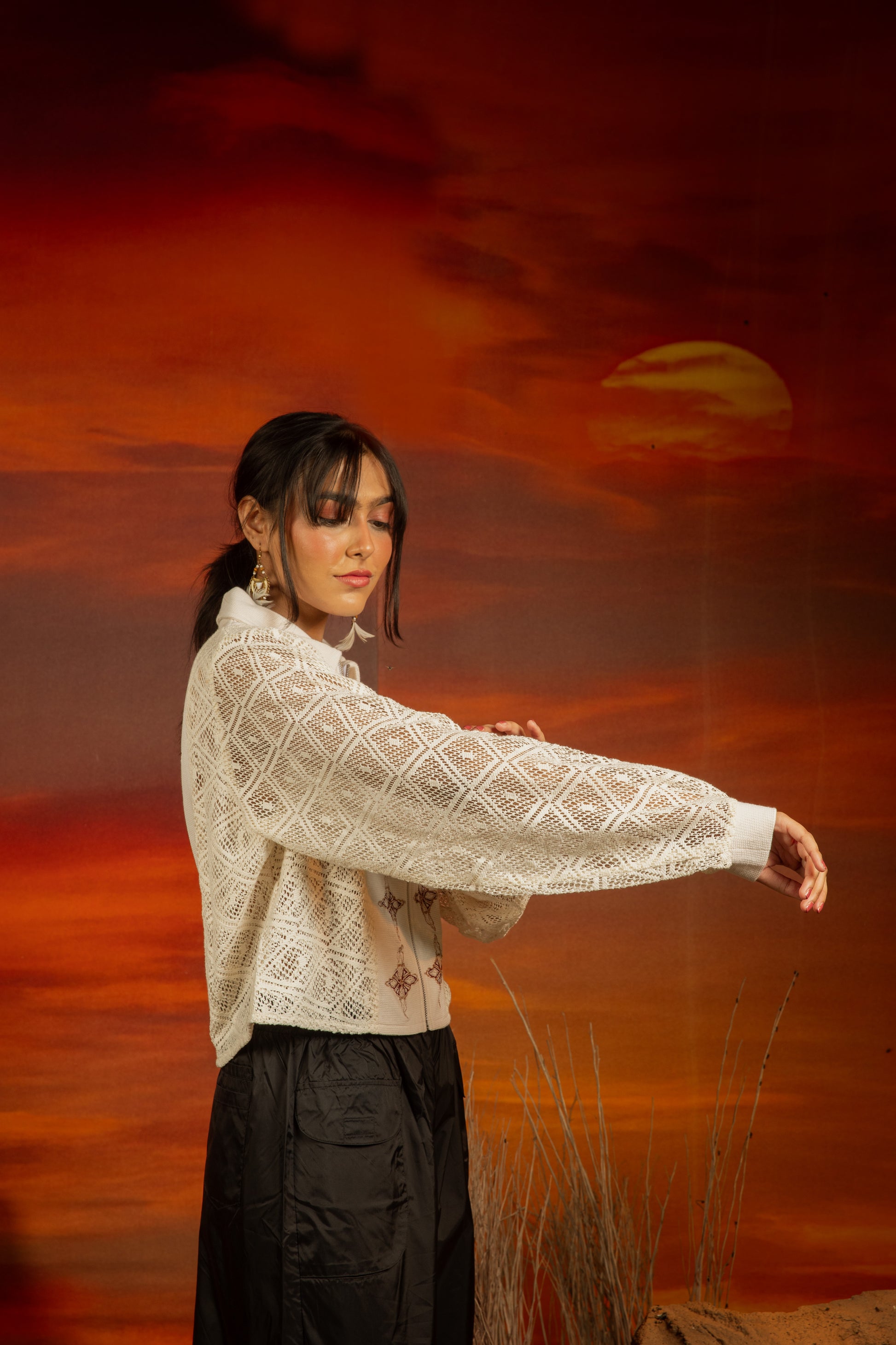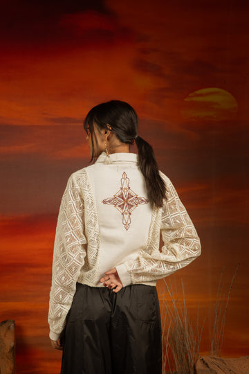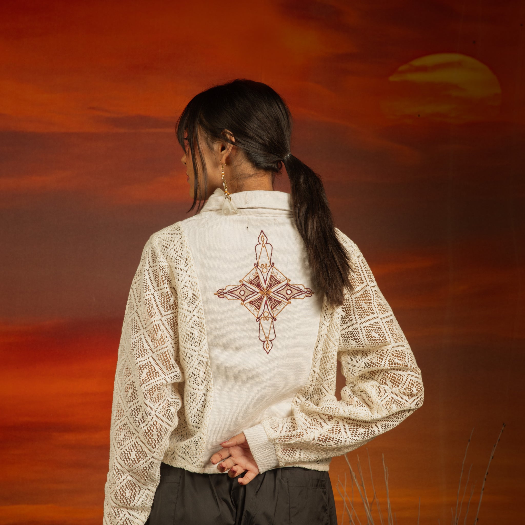 This top features a grounded autumn-weight front panel contrasted by breathable Croscia sleeves that shift with the body. Embroidered across the chest is a reinterpretation of Goa’s colonial-era railings—ornamental, repetitive, quietly assertive.