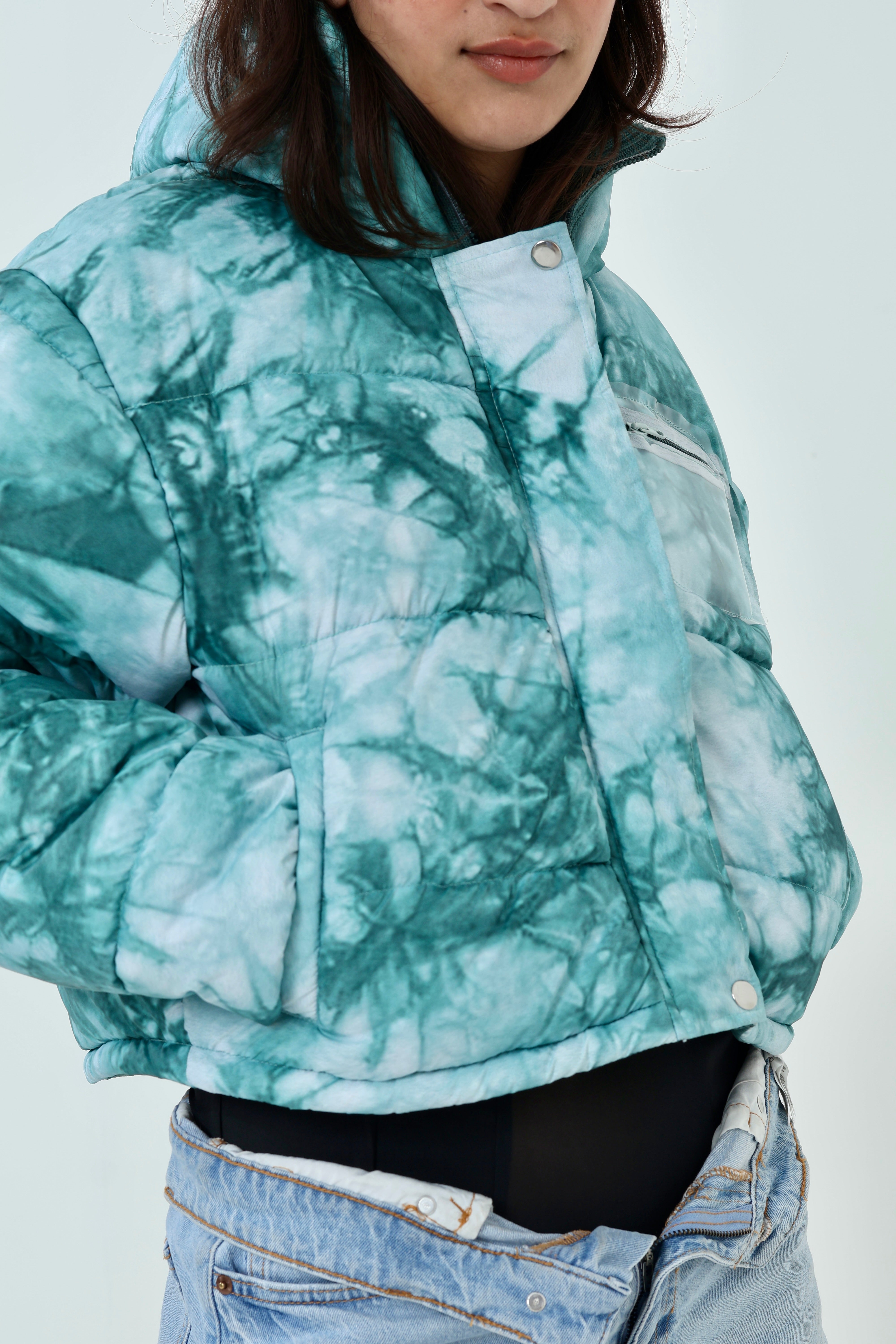 Fabrication - Poly-fabric with tie-dye print having comfortable lining. Extended turtleneck with rib fabric.