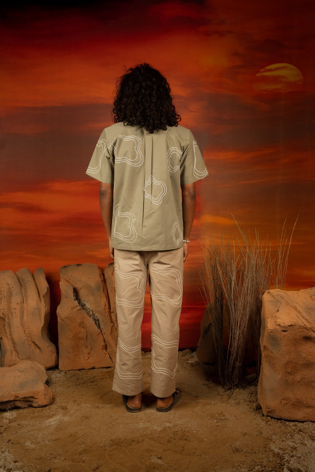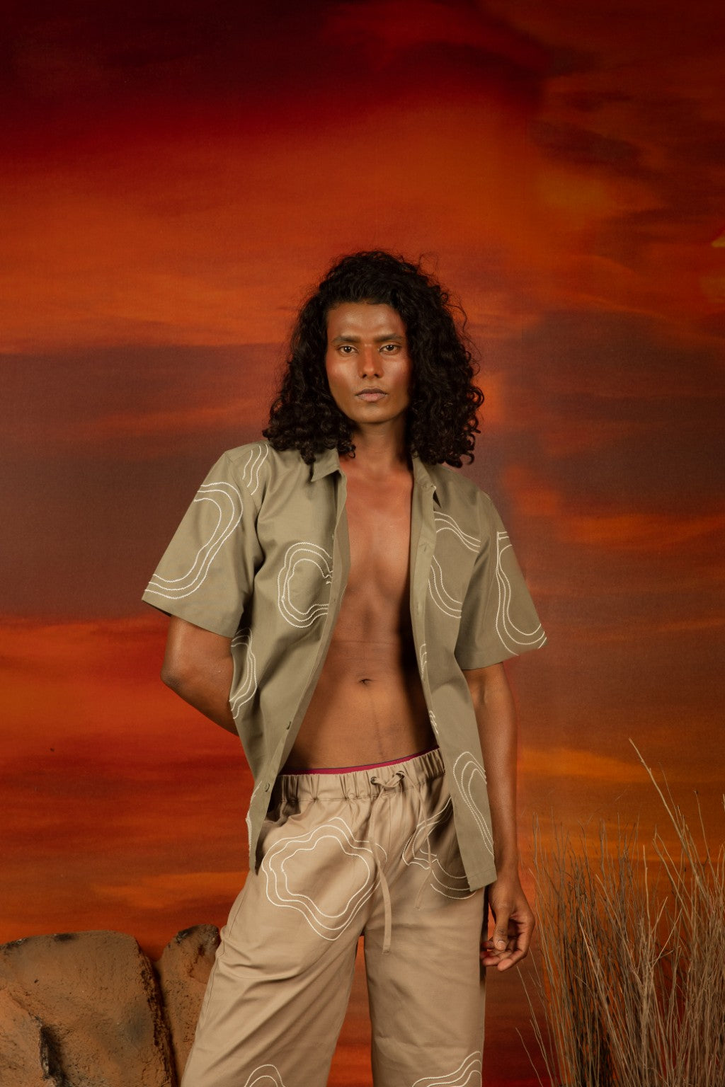 This box-pleated shirt is cut from breathable fabric with a structured drape that holds its shape while staying light on the skin. The silhouette is clean, sharp, and architectural—disrupted intentionally by random cord work embroidery that moves across the surface like hand-drawn lines.
