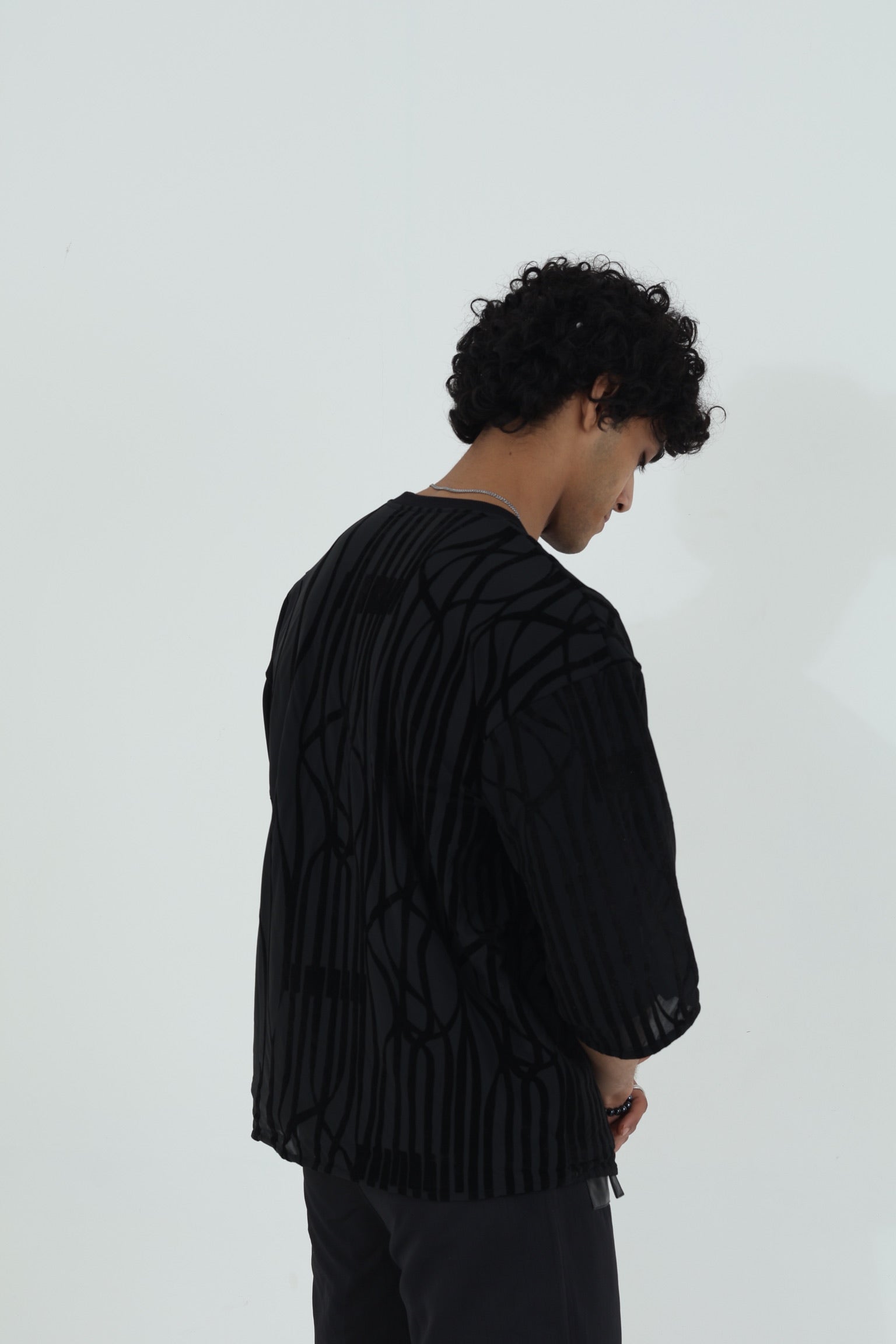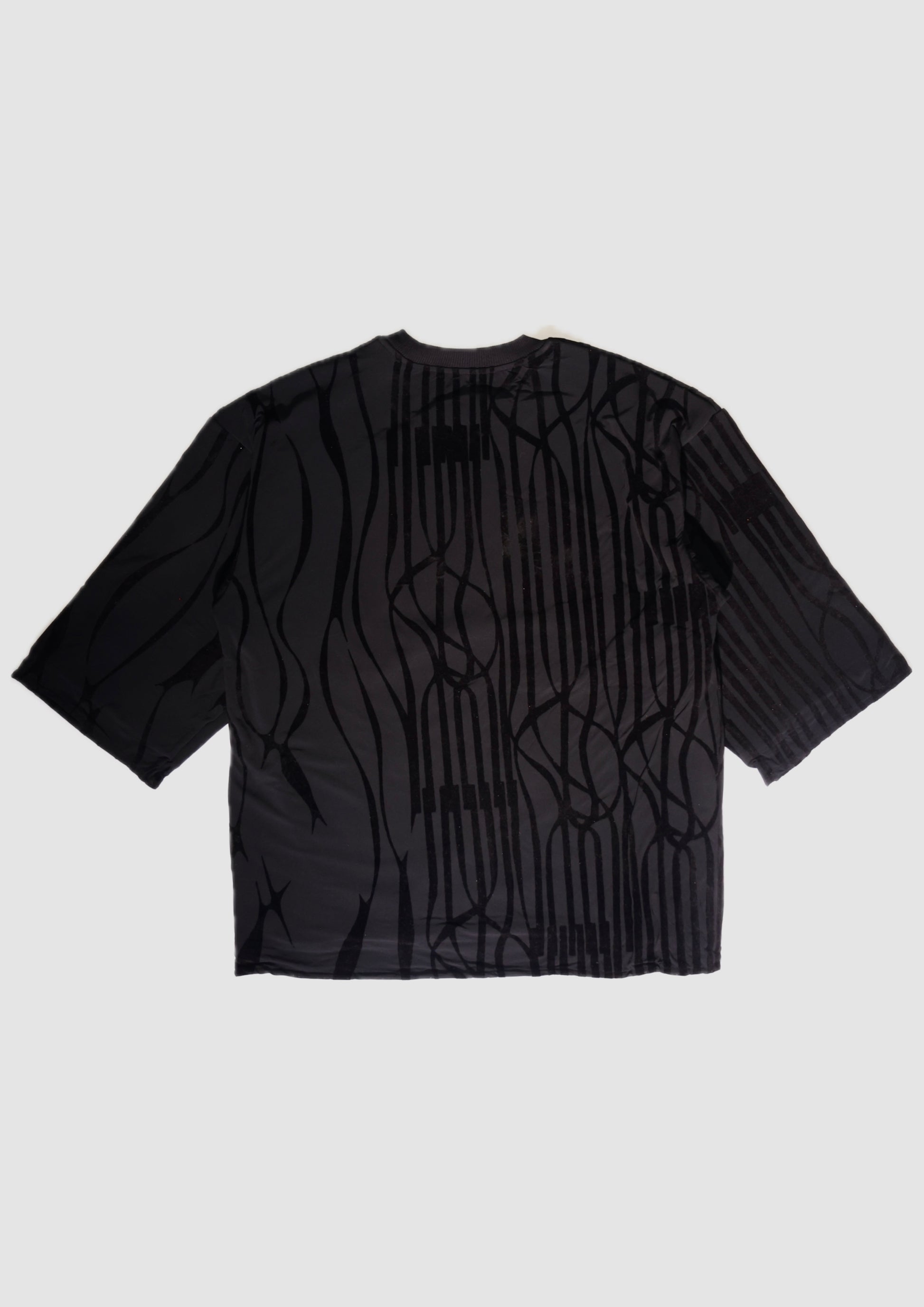 This garment embodies a techno-inspired ethos, blending futuristic design with premium craftsmanship. The intricate mesh overlay and applique detailing create a striking, avant-garde appeal.