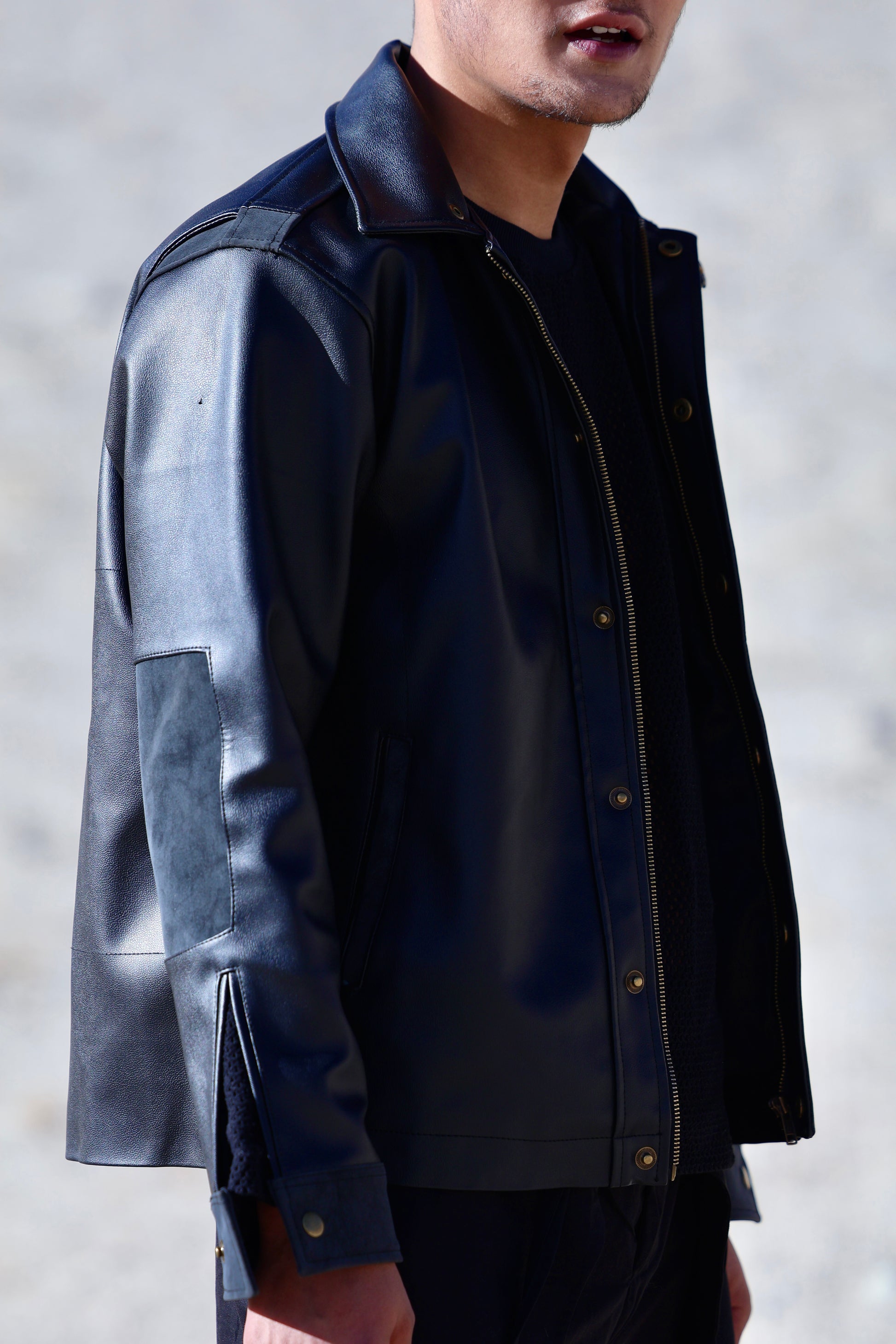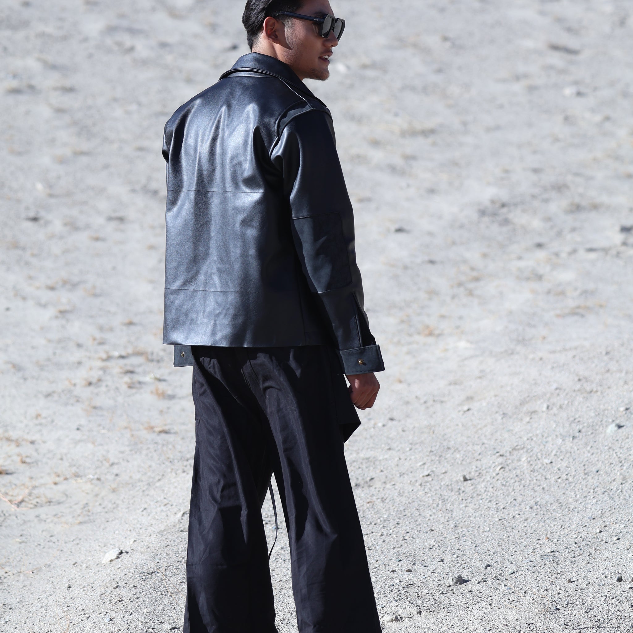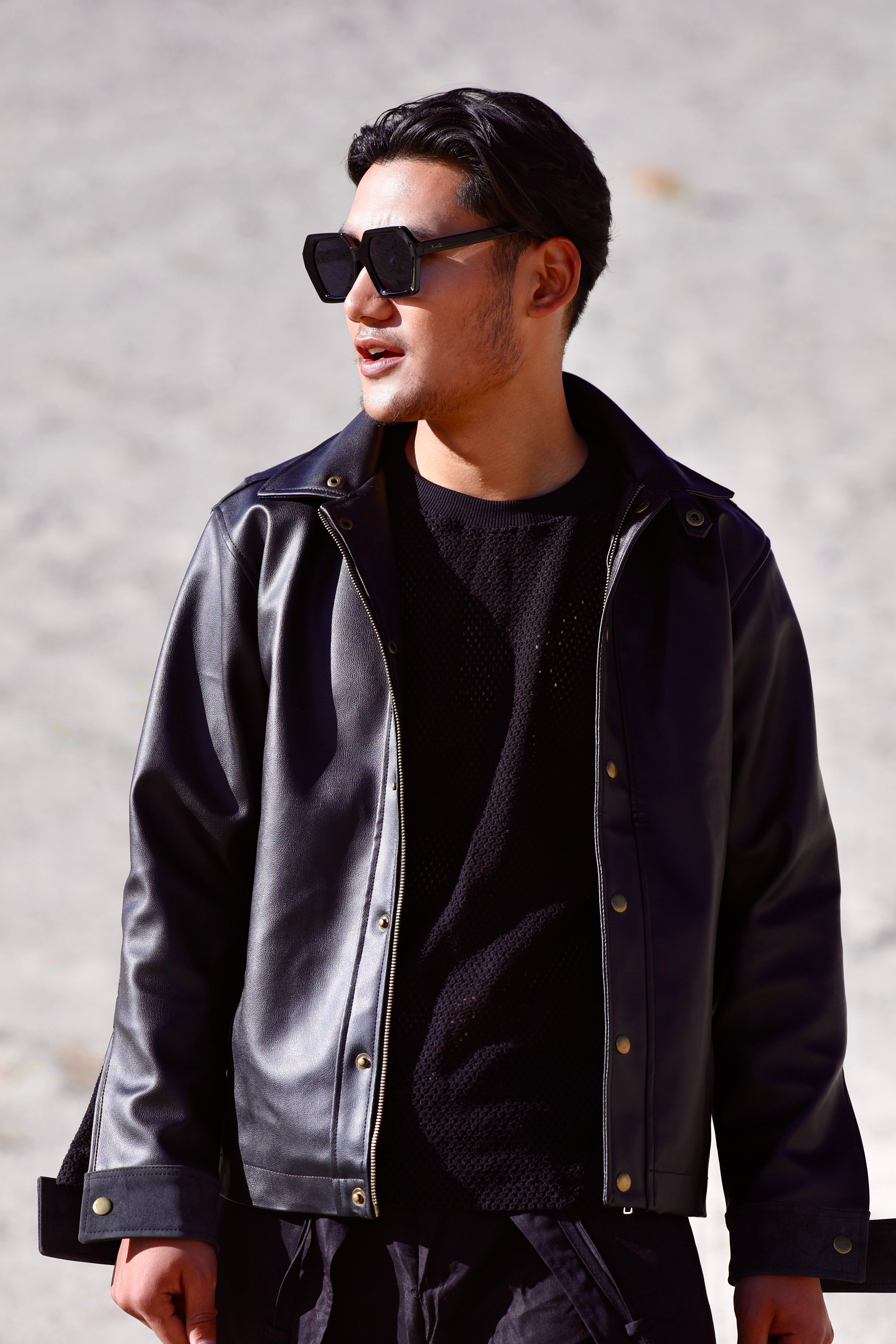 Set against the breathtaking Ladakh backdrop, this black vegan leather jacket redefines modern elegance with its snap button closure. Crafted from sustainable, premium vegan leather, it exudes understated luxury, perfectly complementing the rugged landscape.