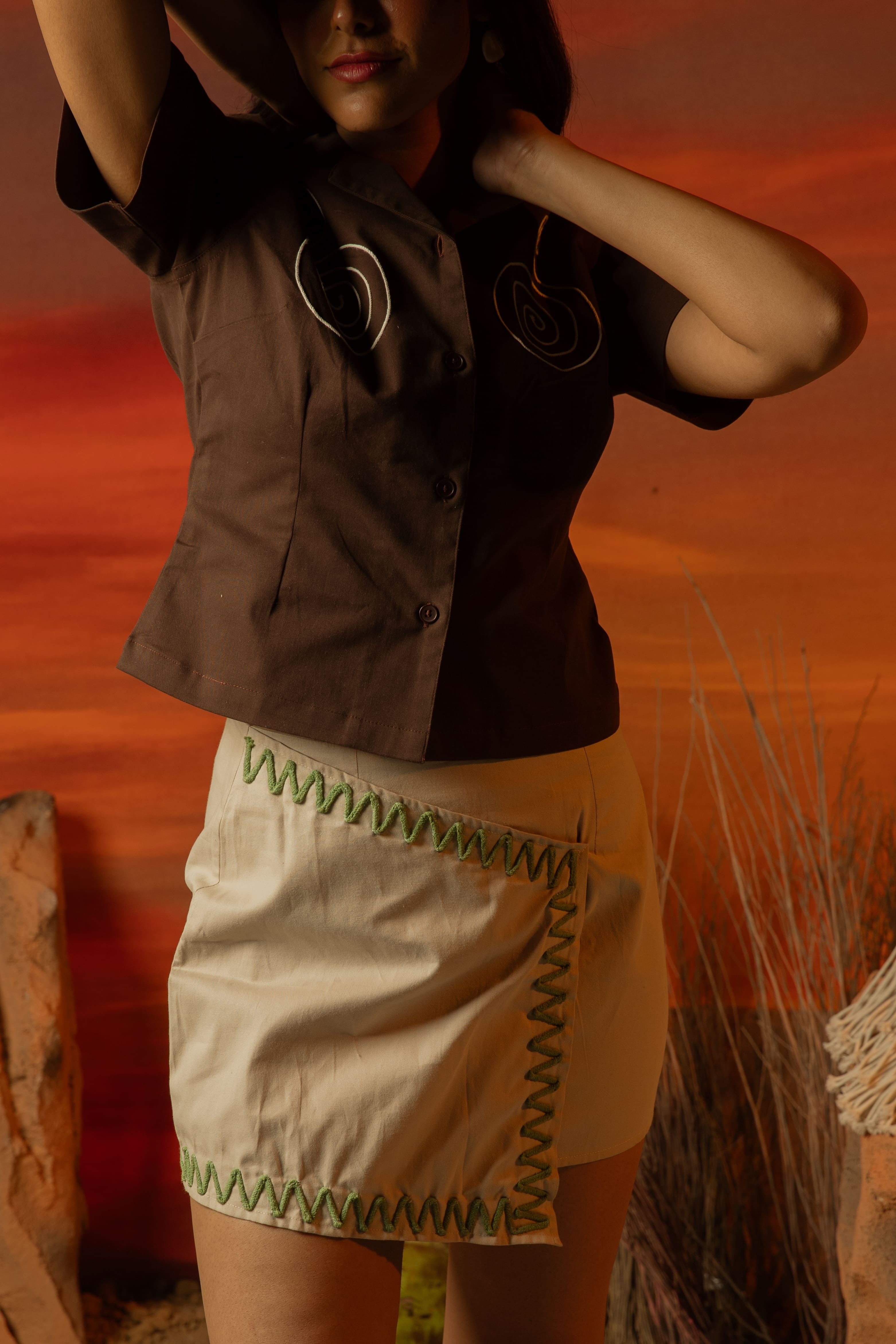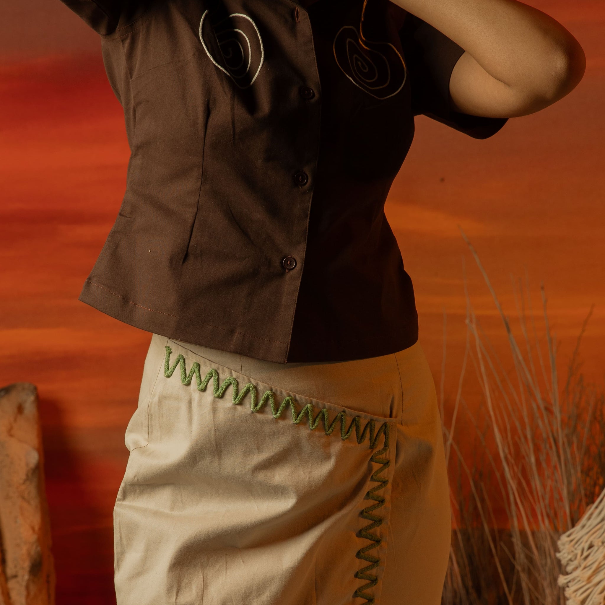 This women’s shirt follows the shape of the body with clean lines and tailored sharpness. Just beneath each shoulder, spiral cord embroidery unravels—a quiet disruption that adds movement to stillness, form to function.
