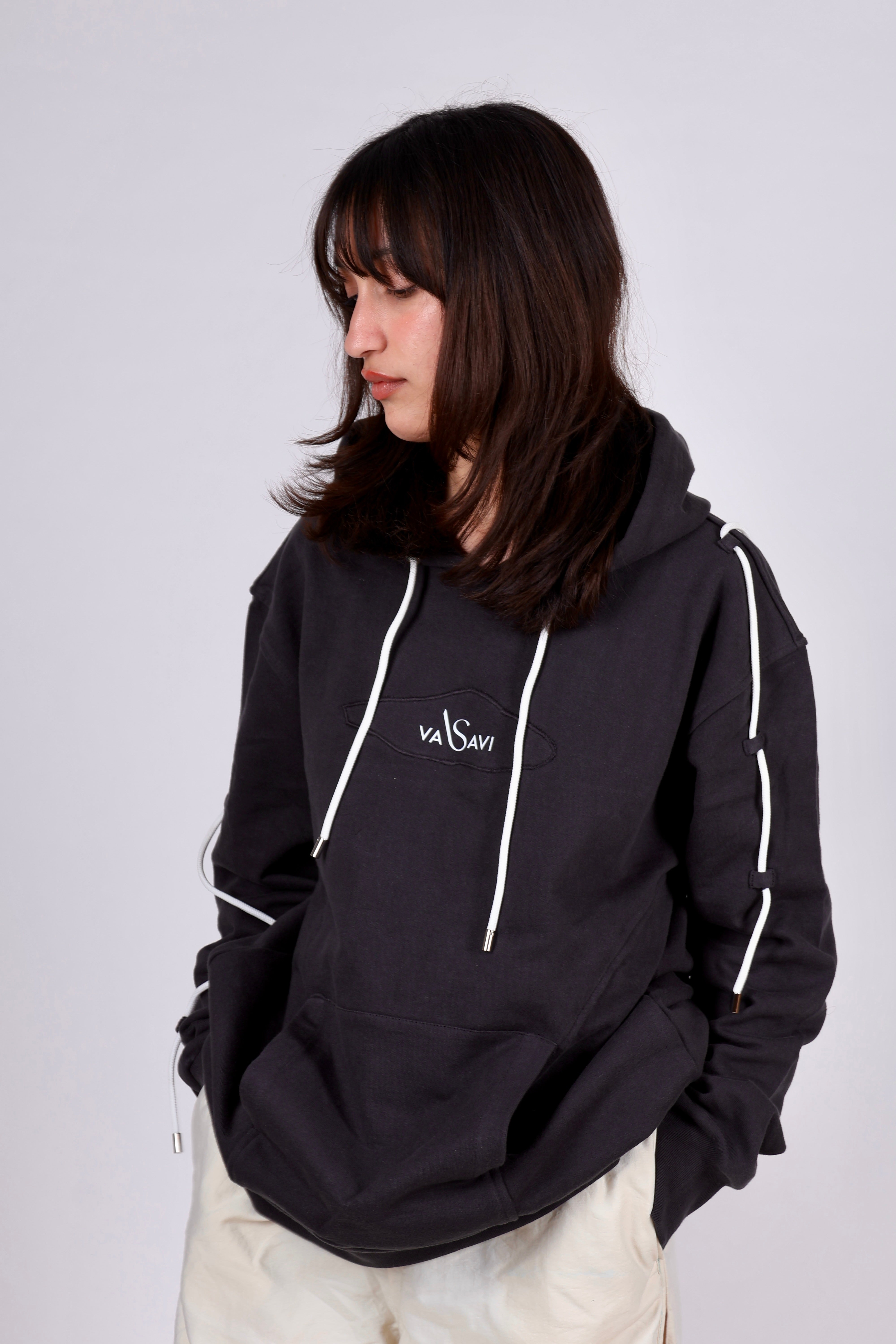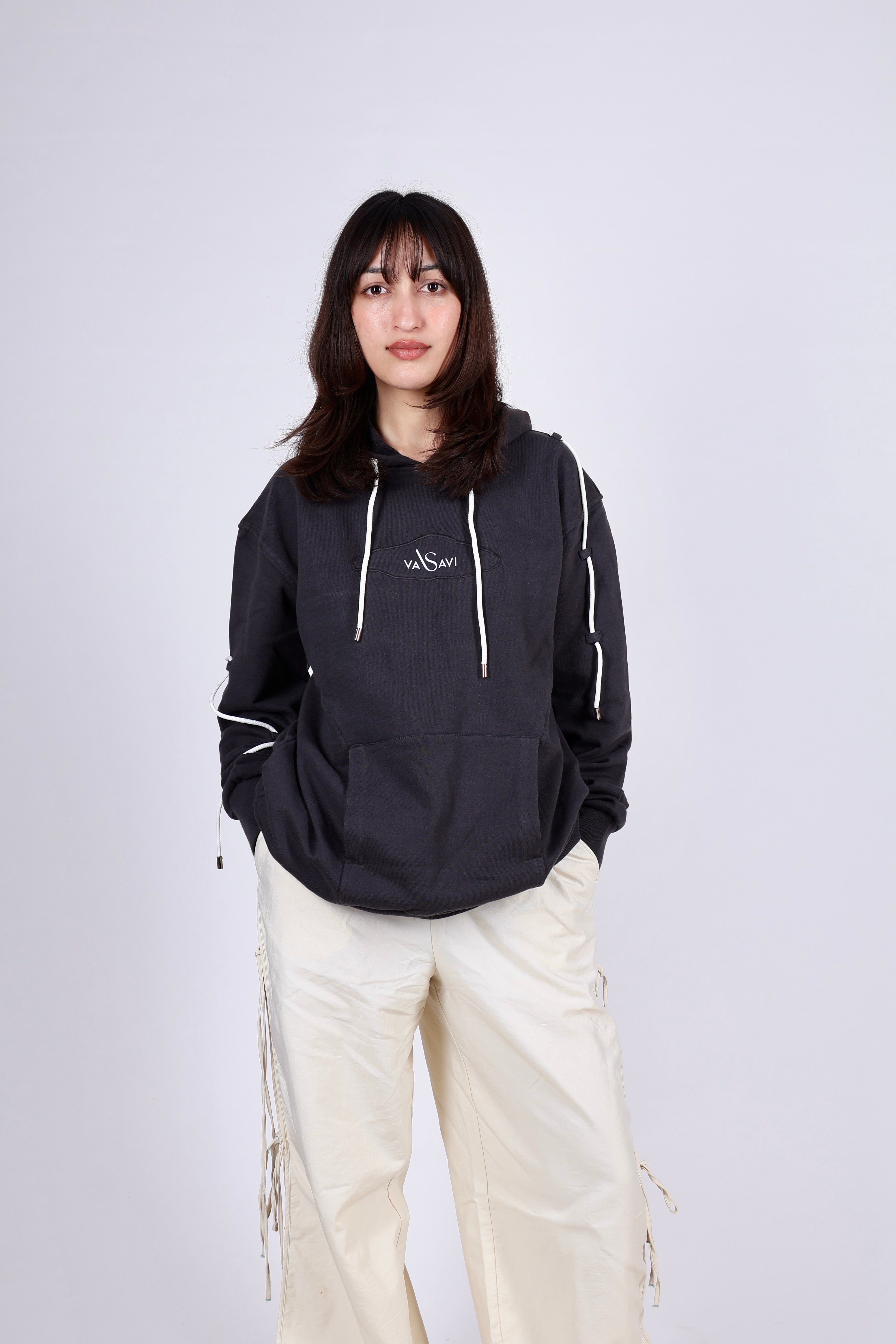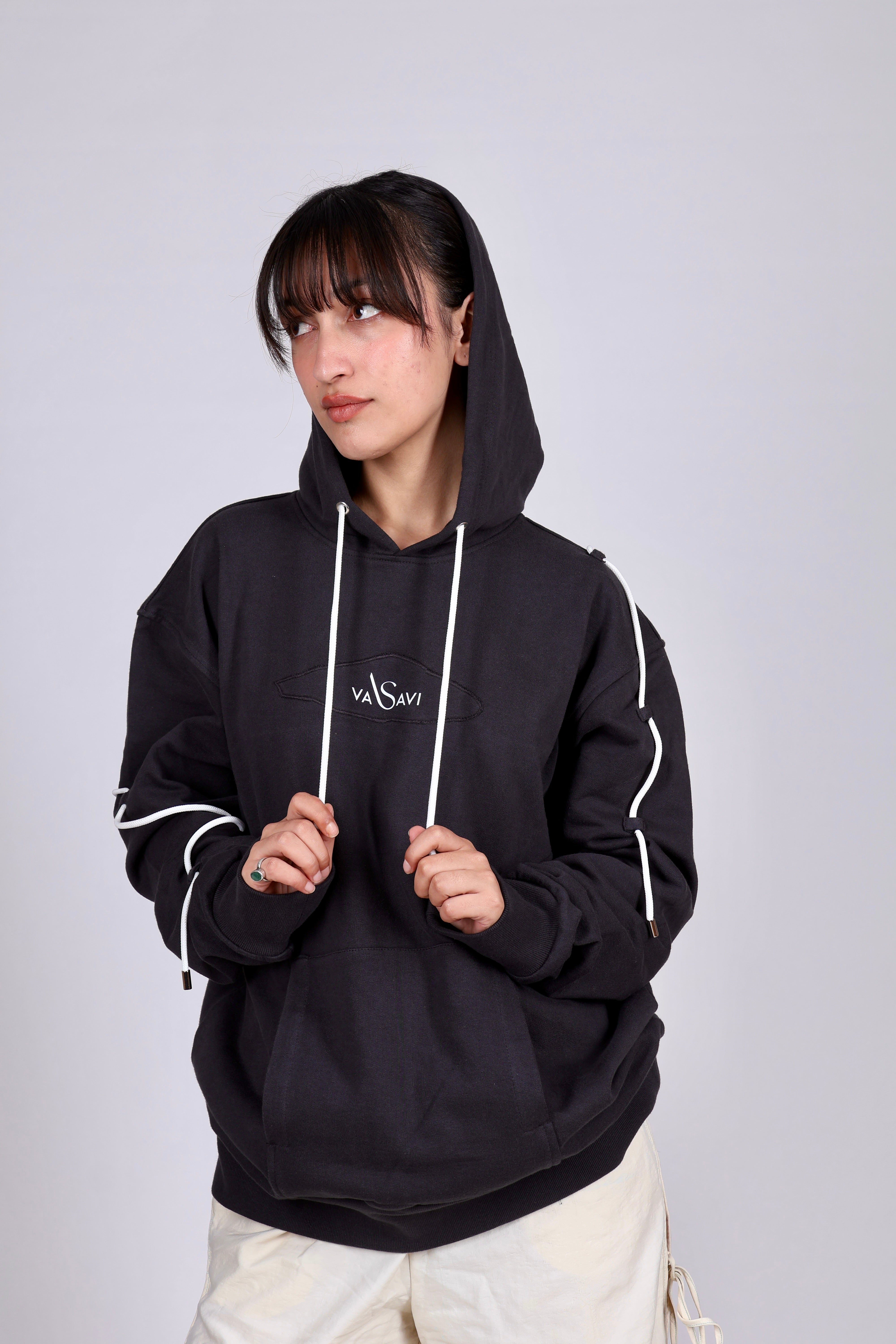 Style - Oversized unisex hoodie with unique styling has been followed. The Vasavi brand embroidered patch and drawstring detailing which is followed at back and on the sleeves is an “adds up element” which make this hoodie more stylish.