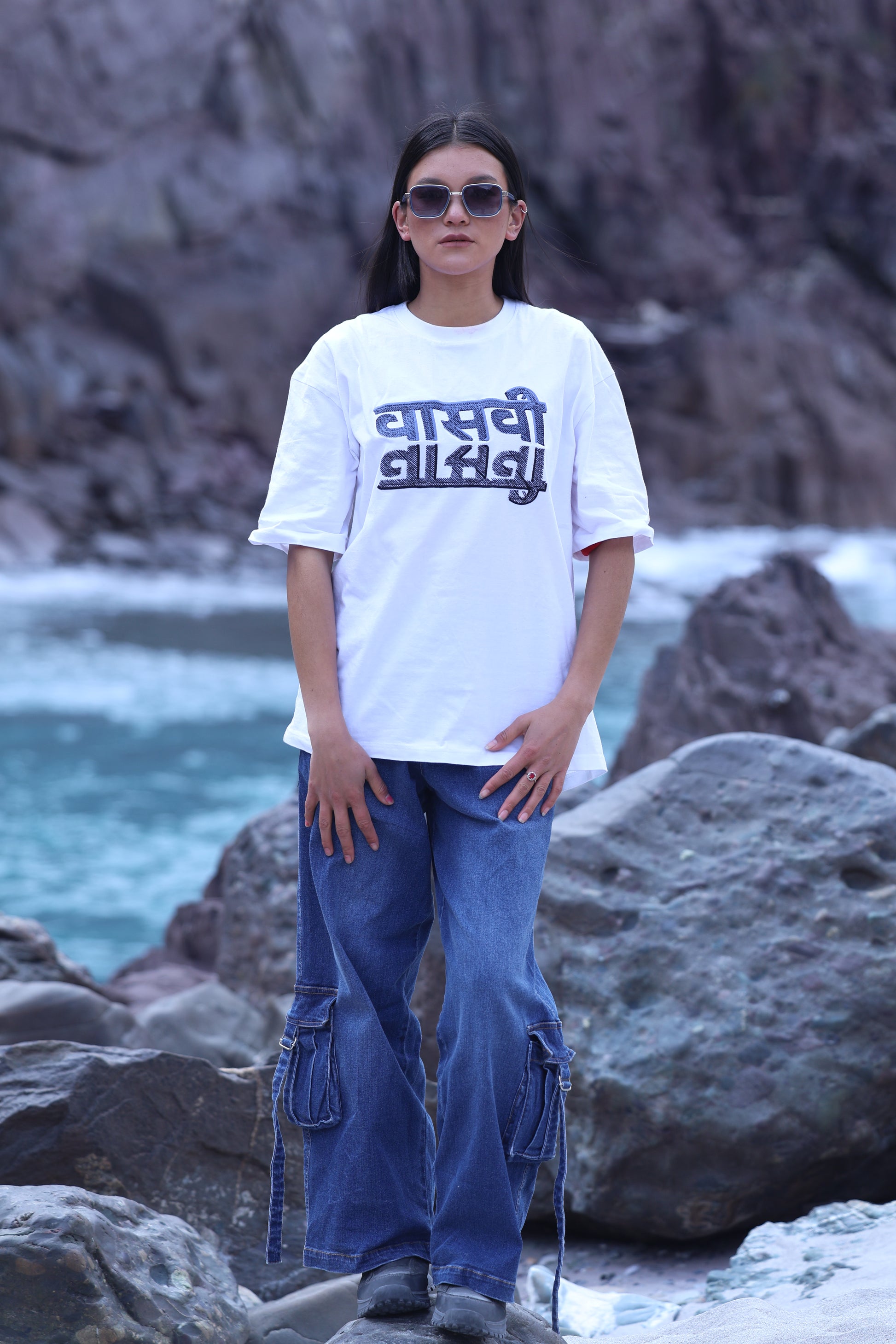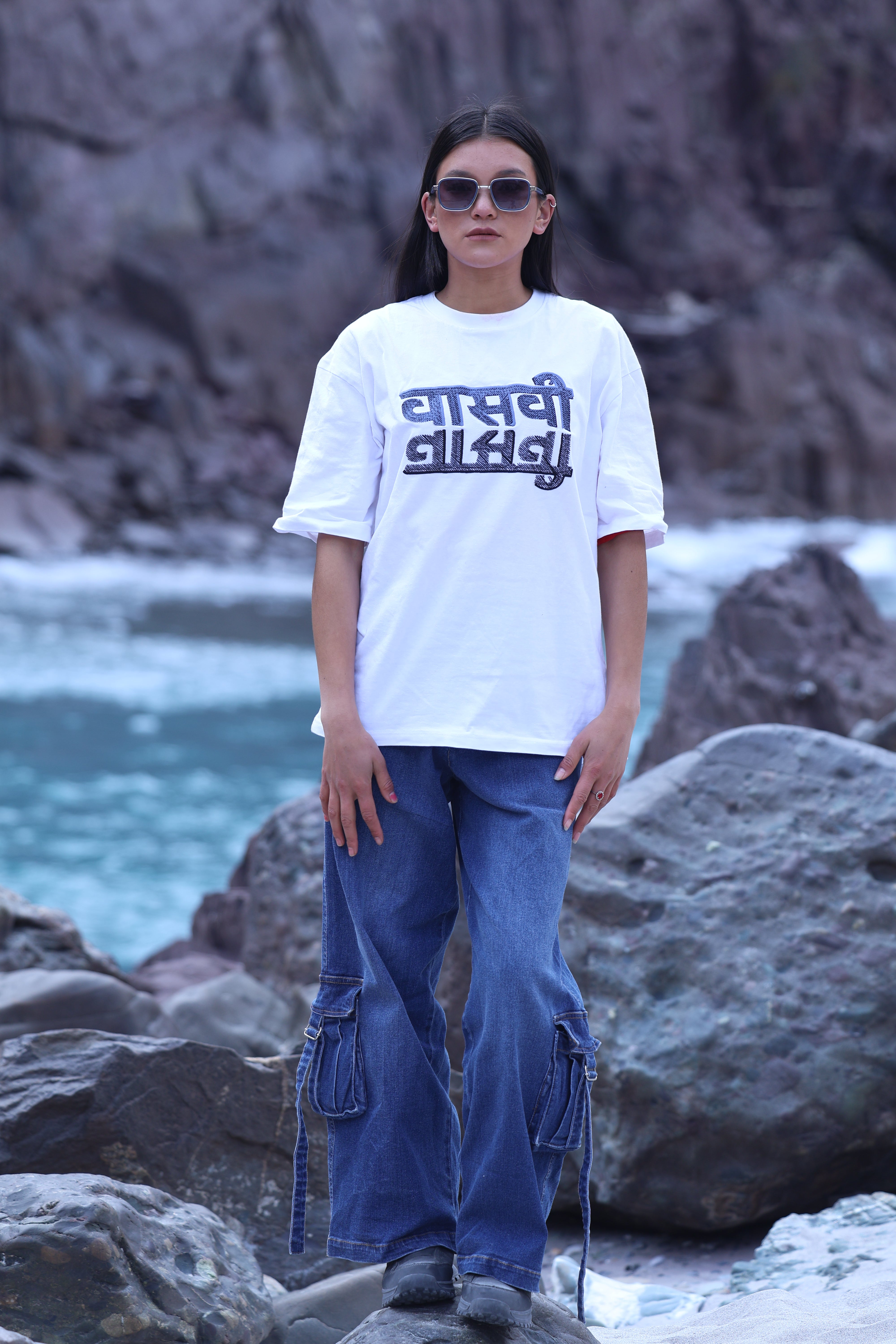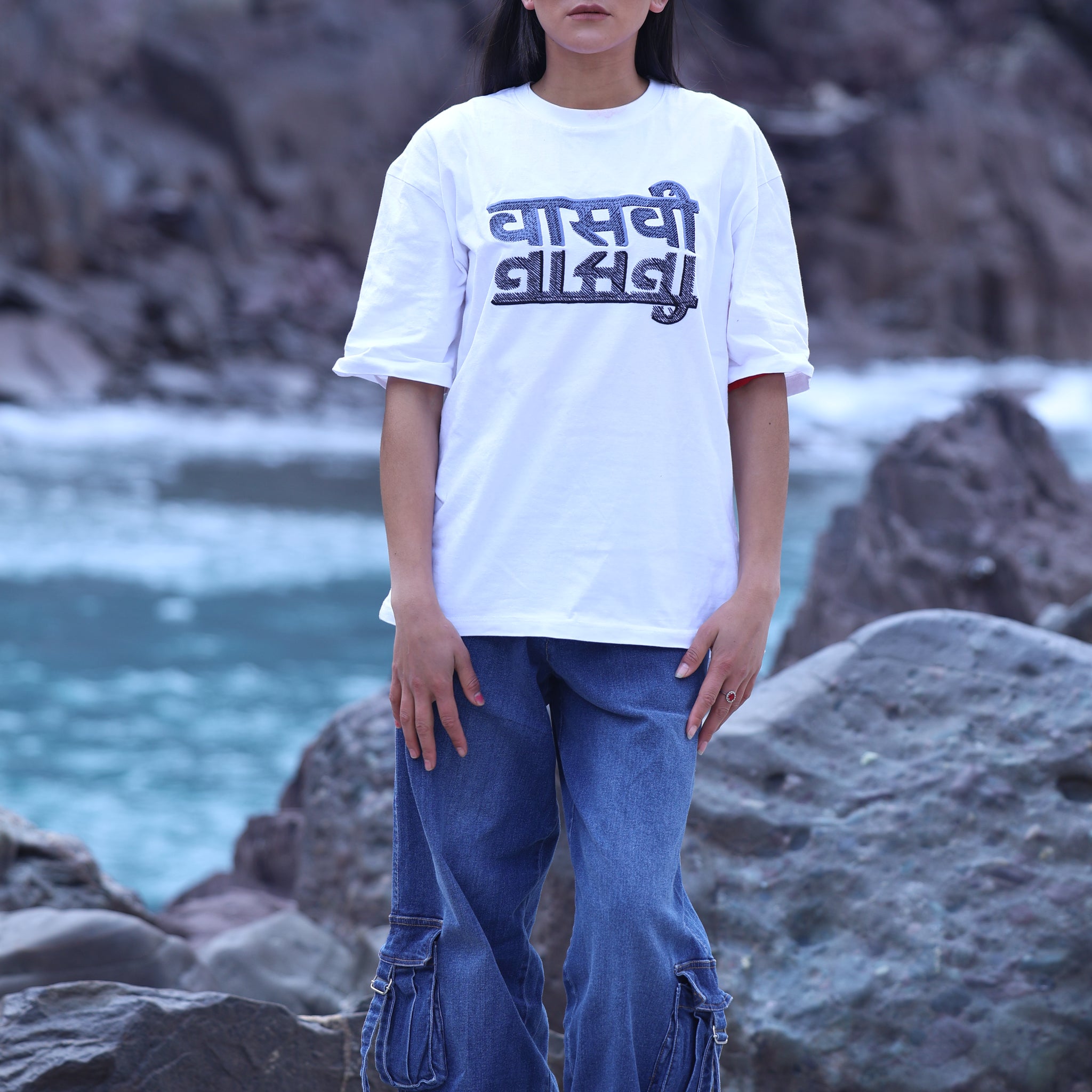 This 240 GSM t-shirt merges timeless embroidery craftsmanship with modern design. The mirror-like Vasavi embroidery and embossed black and blue threads create a perfect balance of past artistry and future style.