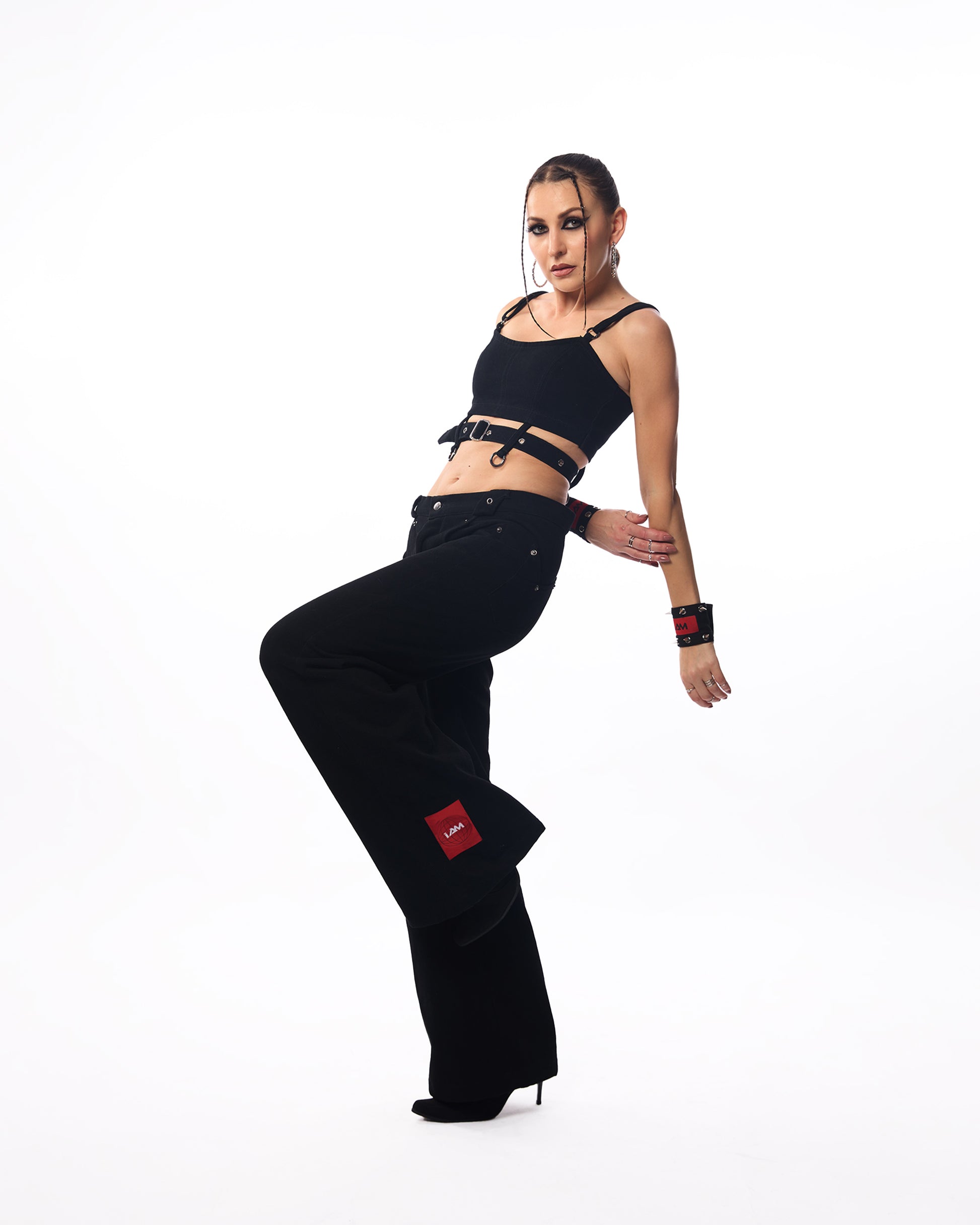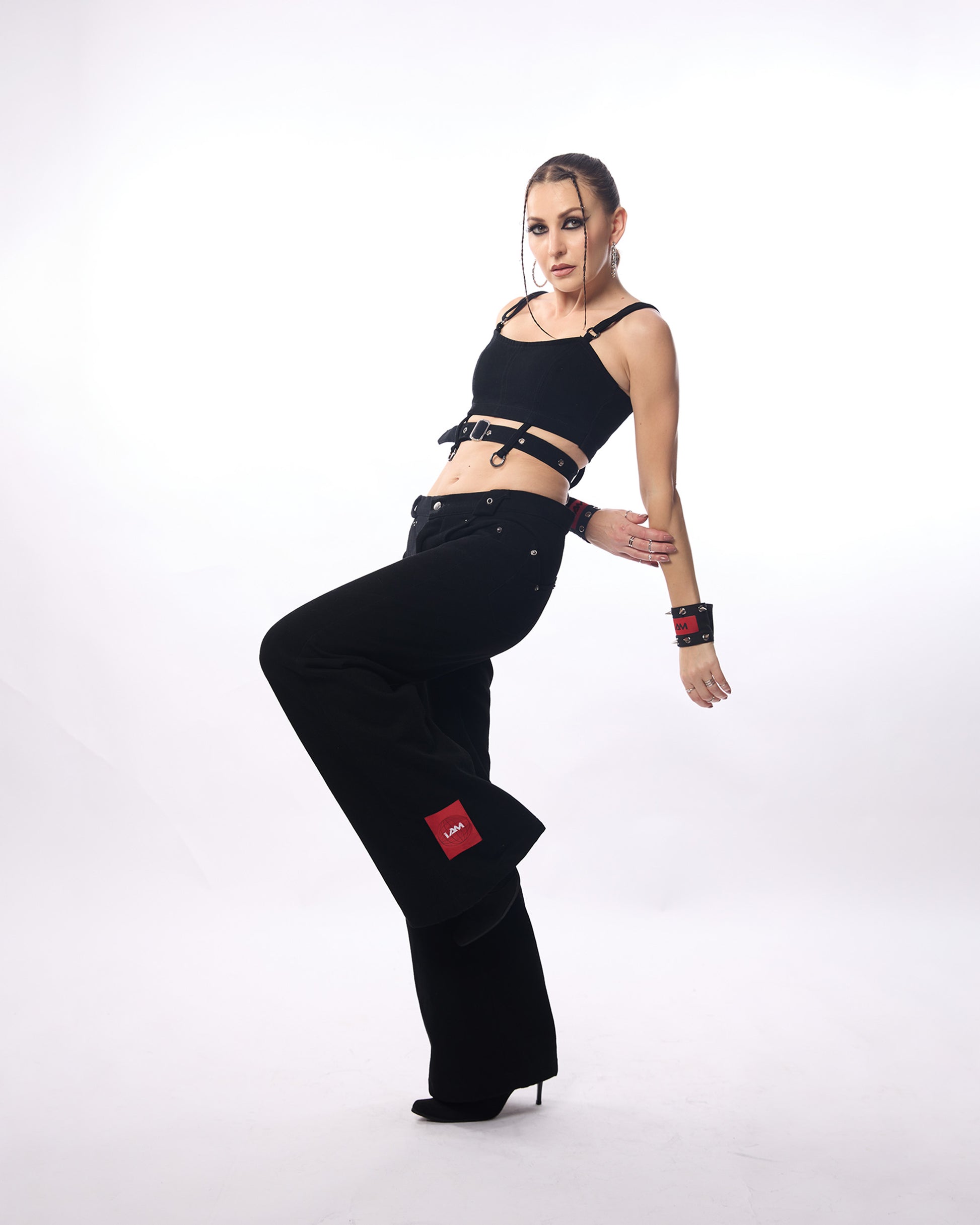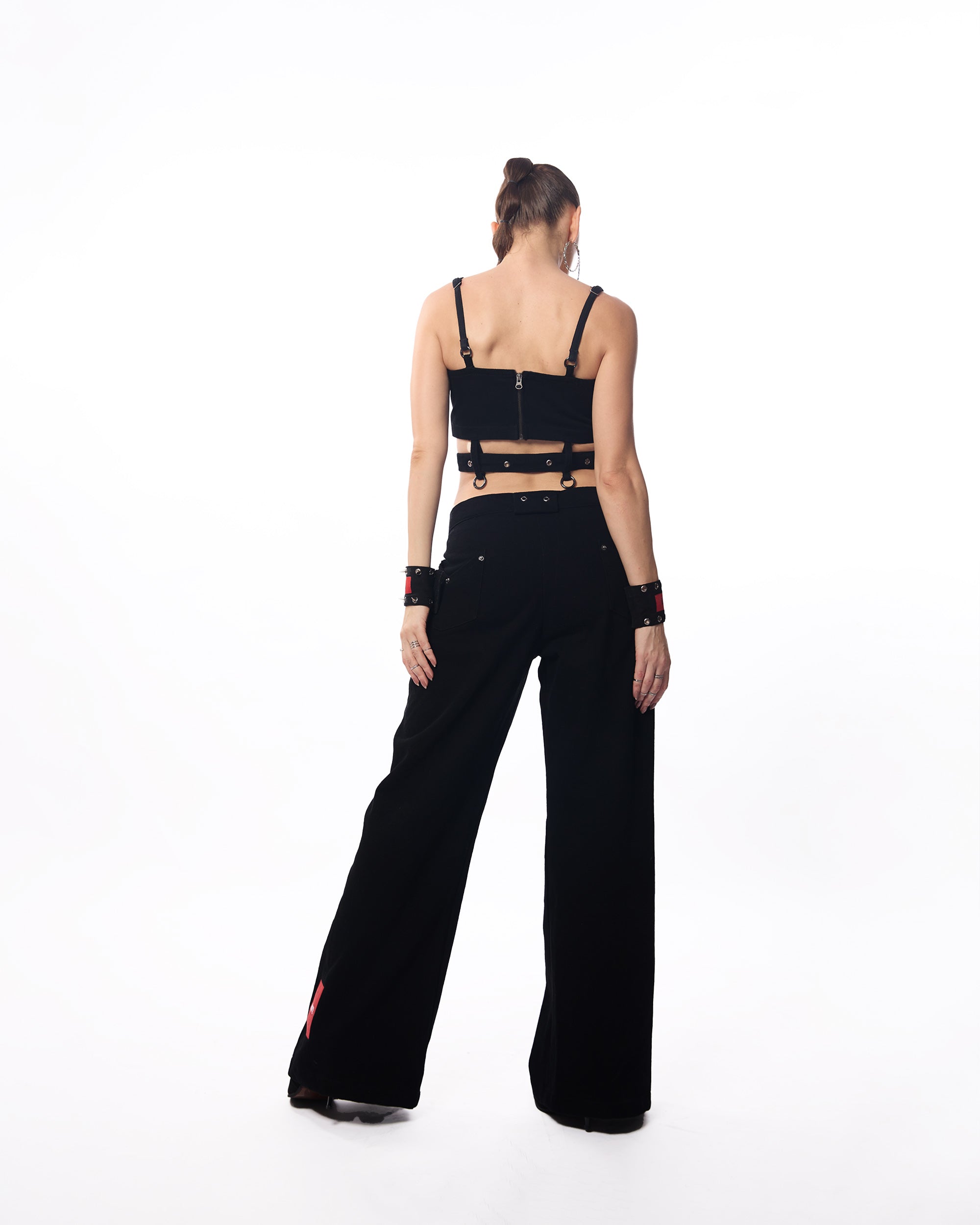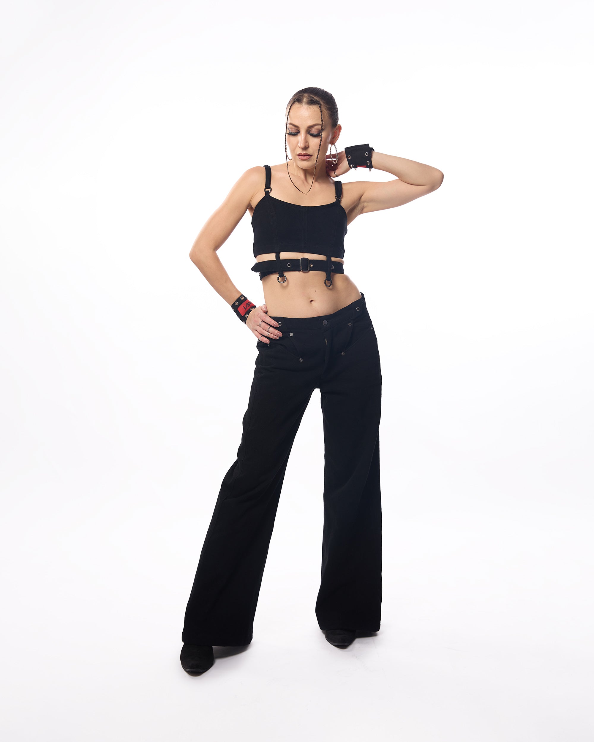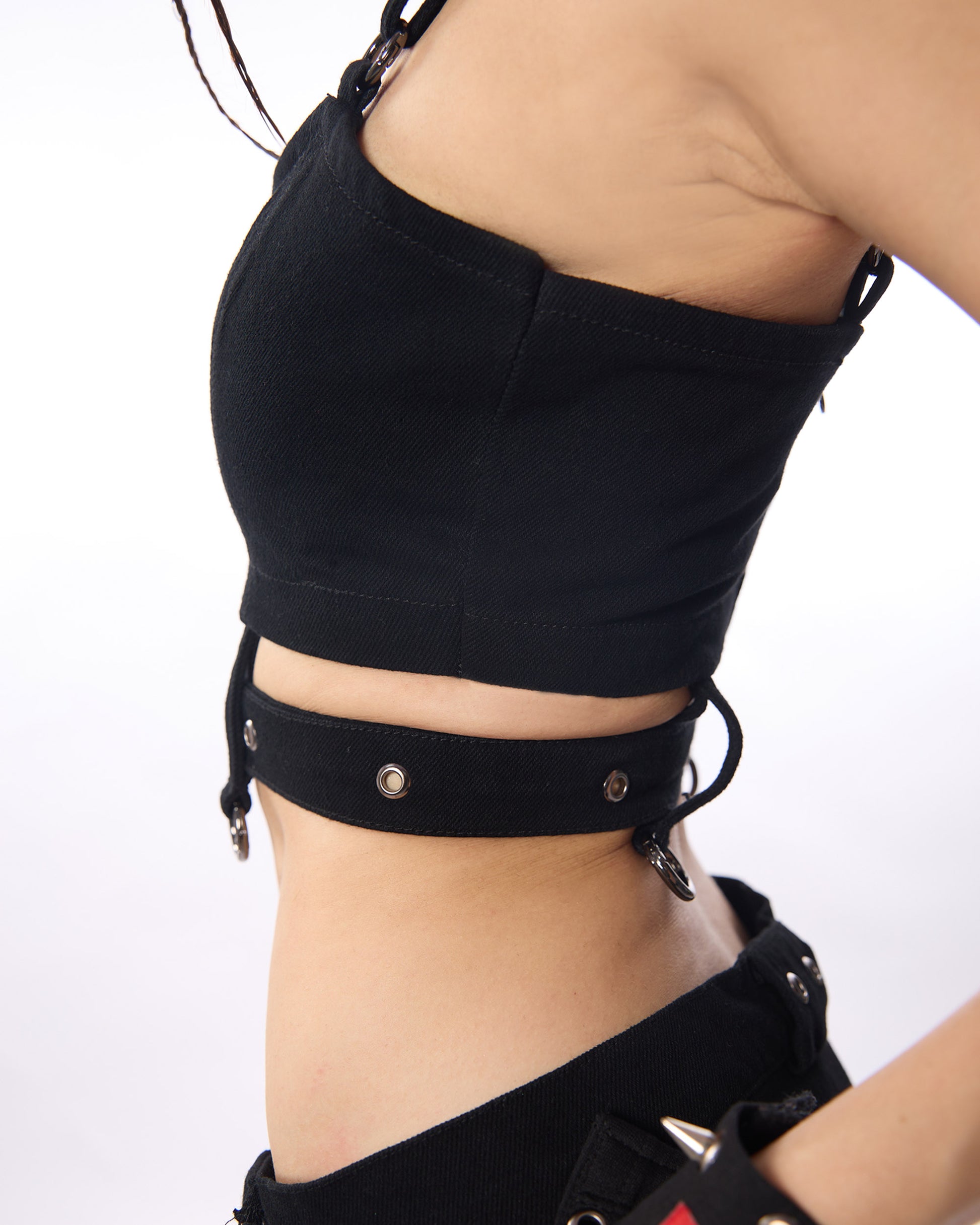 Midnight Muse bralette: Crafted from structured black denim, this bralette features a sleek belt detail that cinches the waist, accentuating your silhouette. The zip-up back adds convenience and a polished finish, while the minimalist design makes it perfect for layering or wearing as a standout piece.