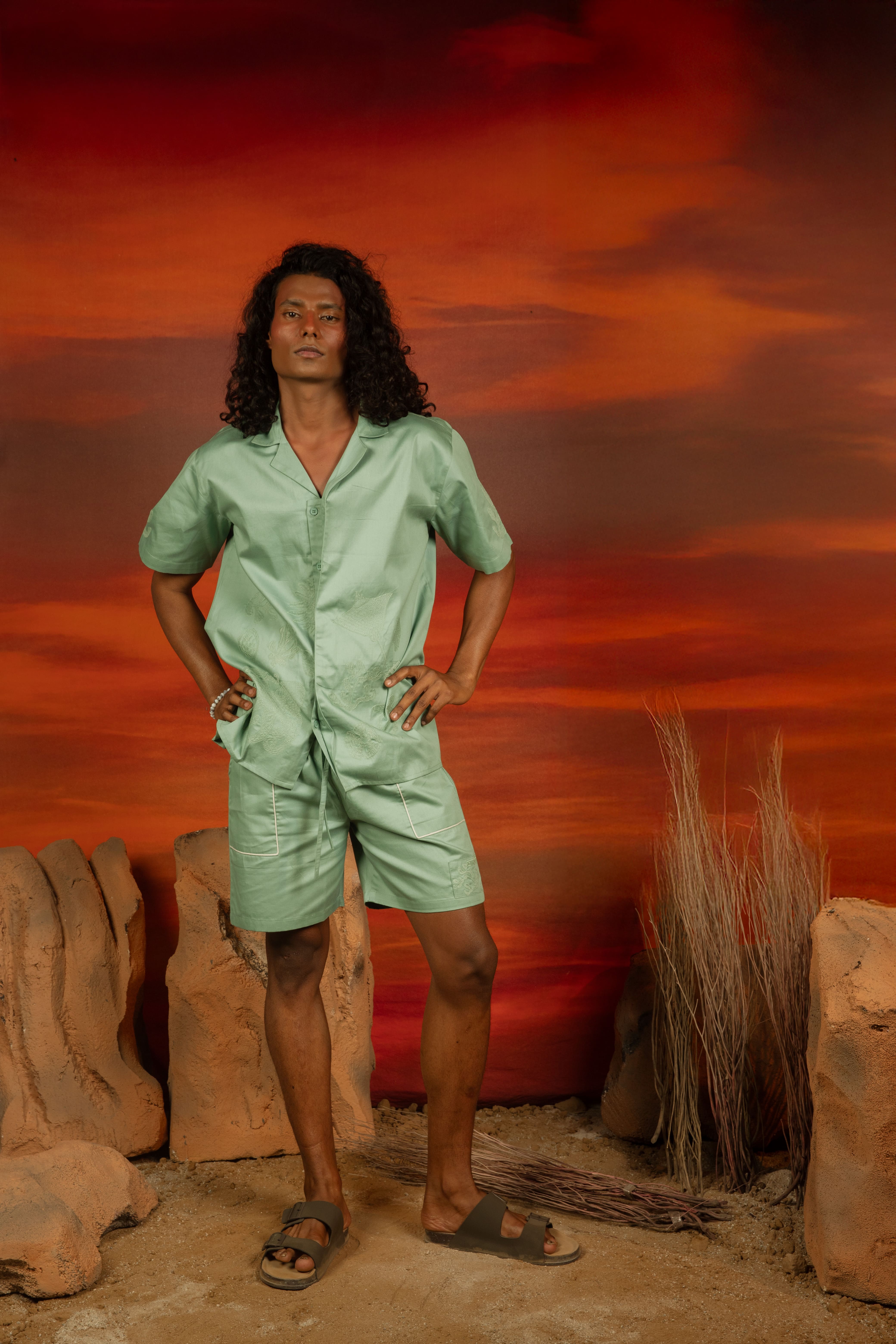 These shorts are tailored in soft, breathable cotton twill to complement the flow of the matching shirt. Cut for structure without stiffness, they feature a relaxed fit and clean lines—finished with an embroidered Vasavi patch that speaks without shouting.