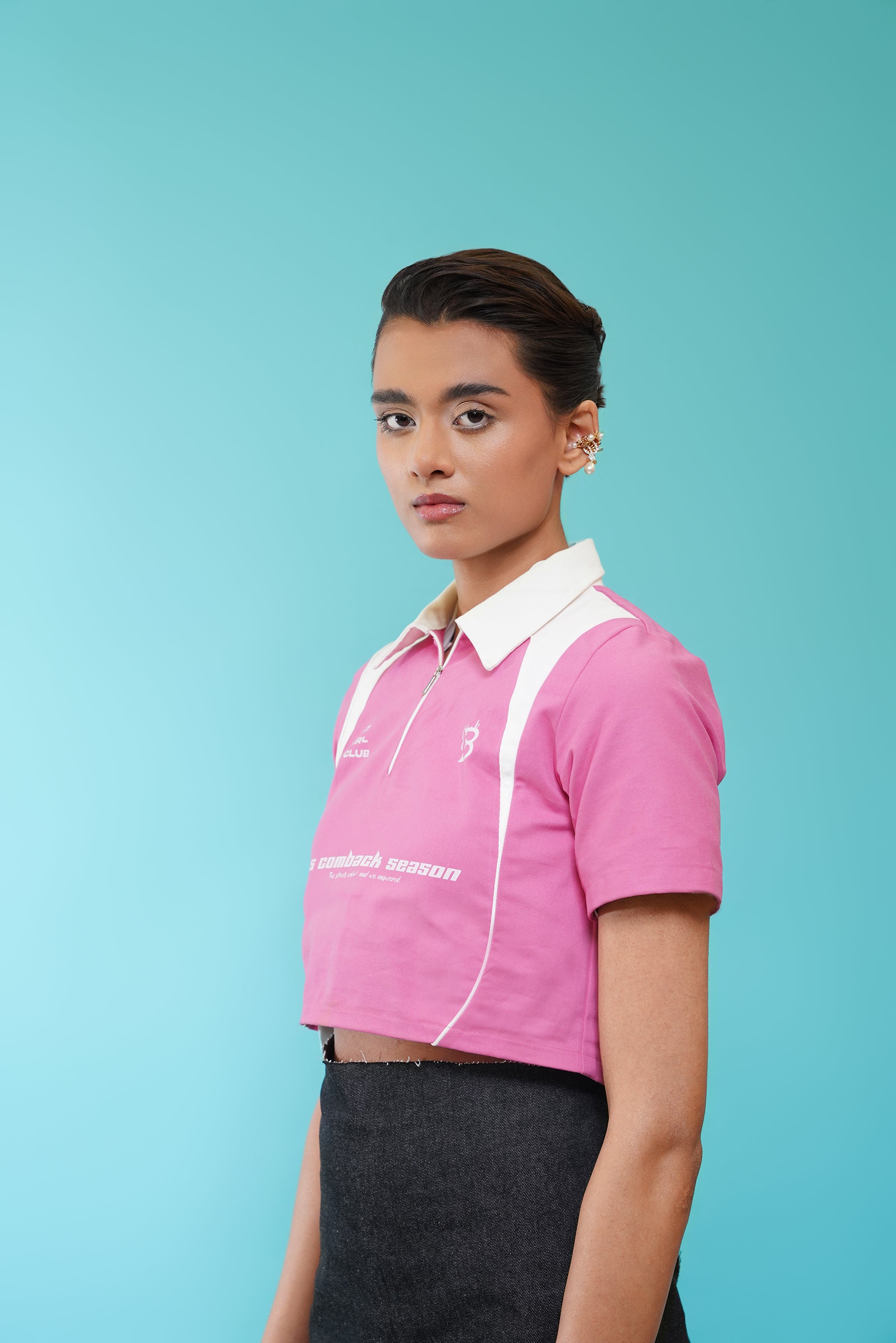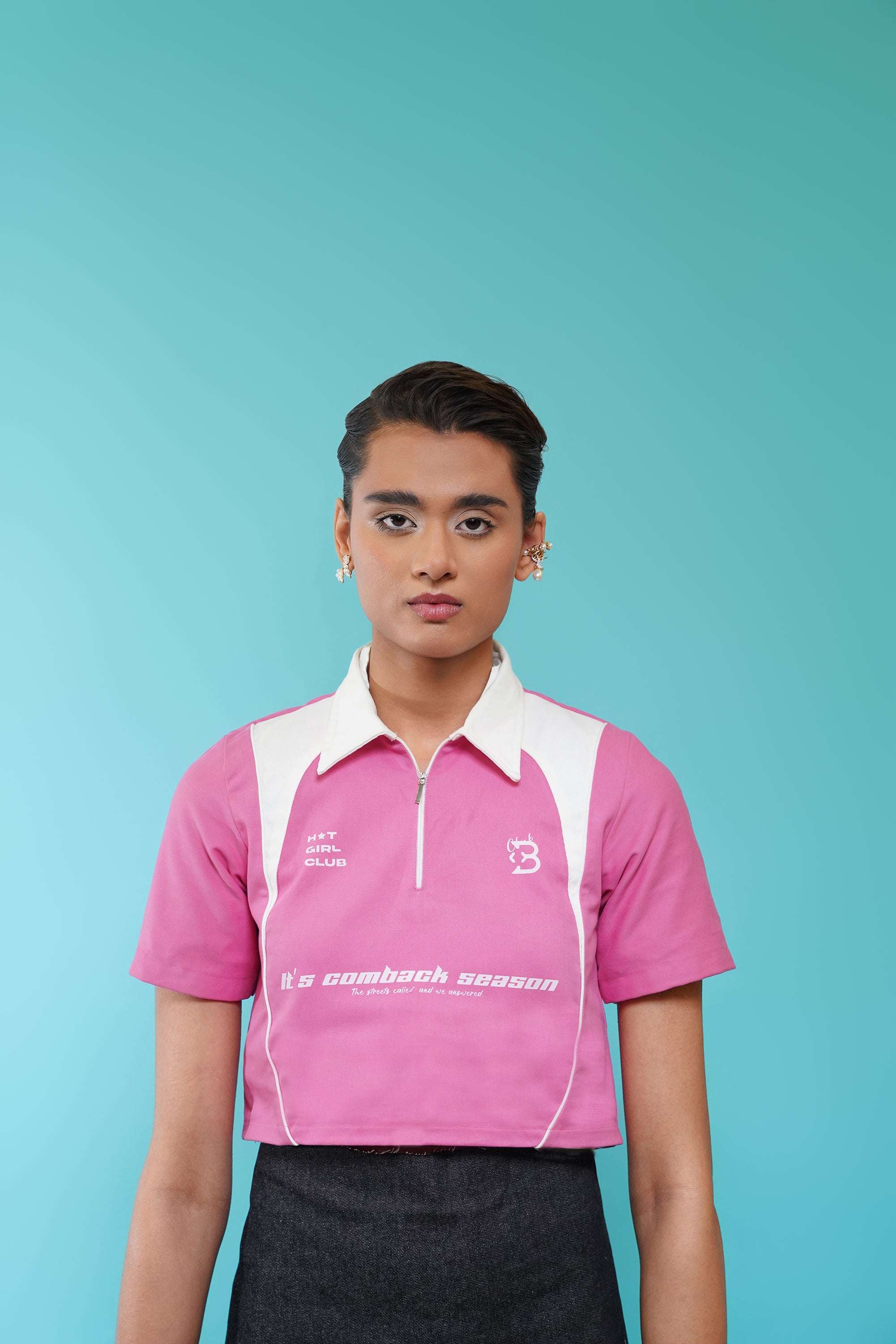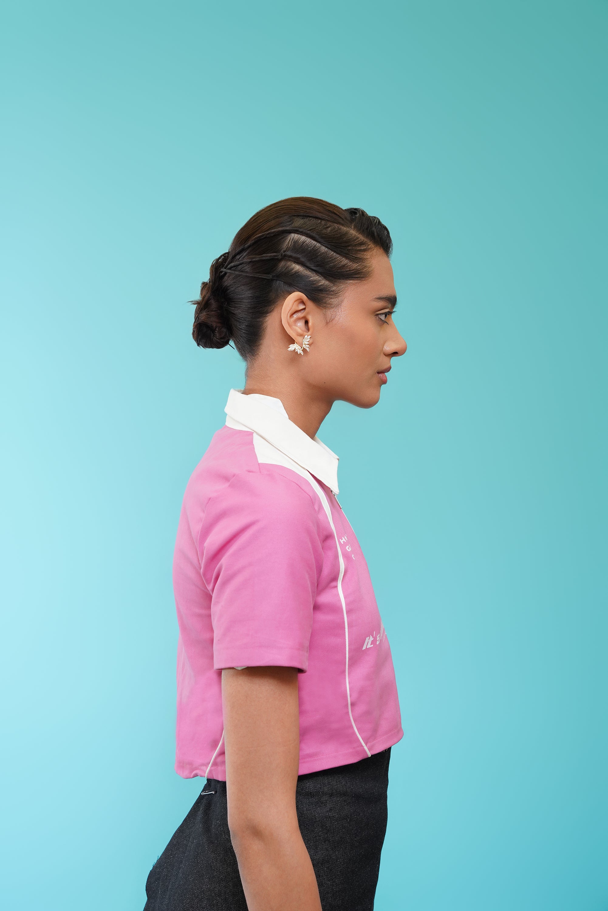 Sporty street style, reimagined. Our Pit Stop Pink Tee features contouring white color blocks and a zip-front detail. Bold racer prints complete this stylish, statement piece. This Pit Stop Pink Tee delivers a sporty-chic vibe. Crafted from comfortable cotton twill.