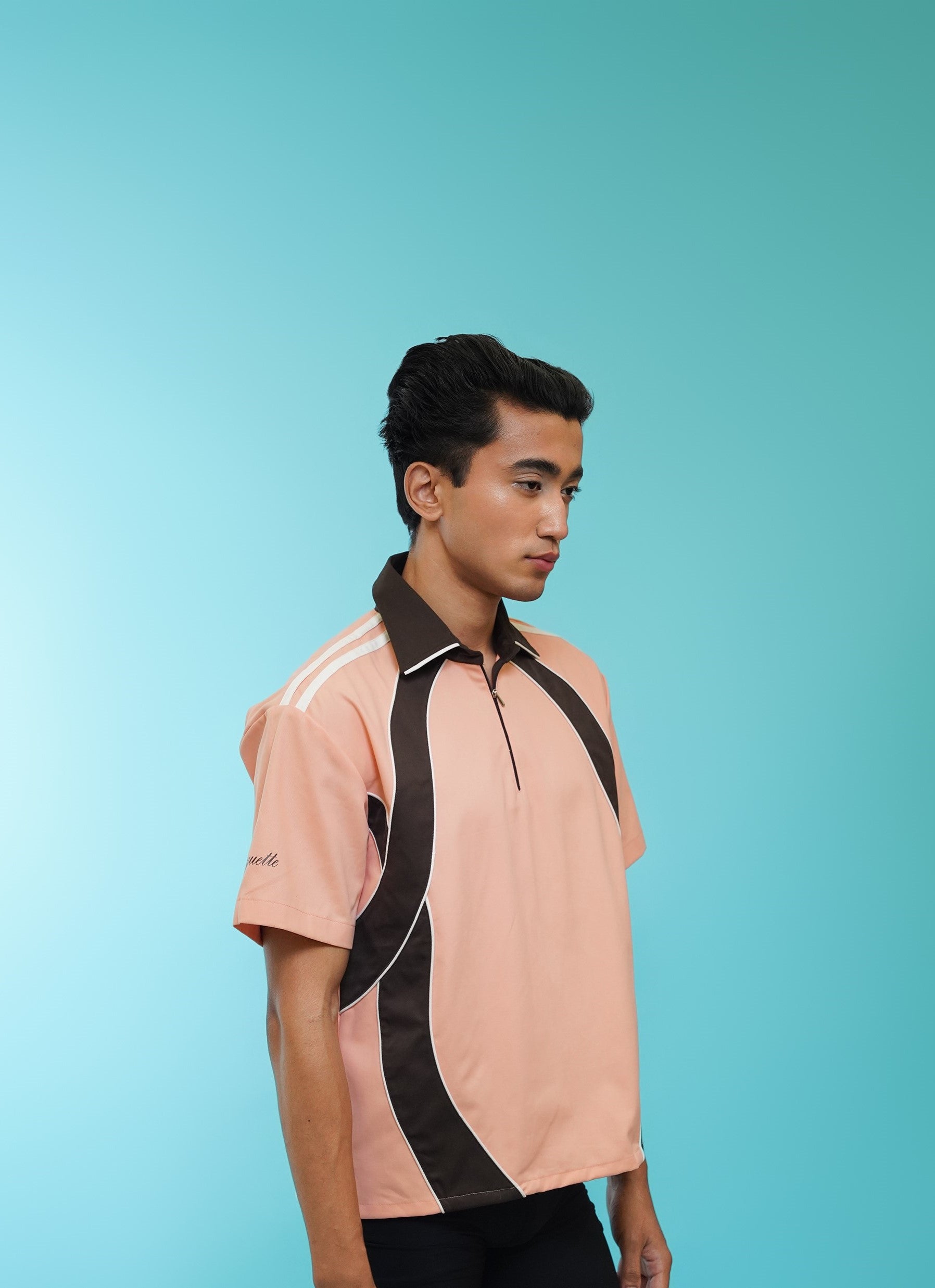 Our Unisex Pitch Polo Zip Tee features bold brown curve patches and clean white line accents. A sporty and artistic blend, this tee features a zip front and detailed piping for a relaxed, standout look. The contrast color stand collar showcases intricate attention to detail, with contrast piping further enhancing its design. The fit is relaxed and oversized, and sits smoothly on the body.