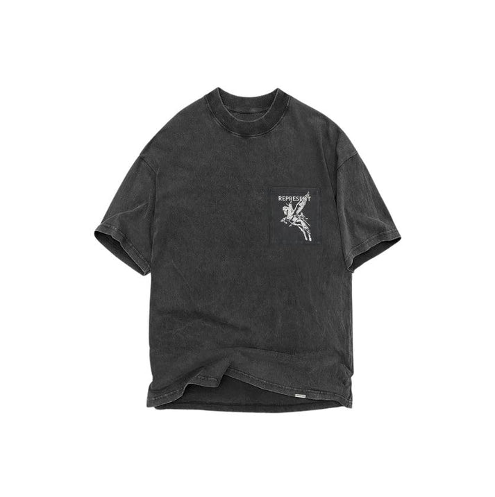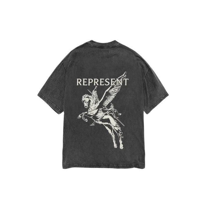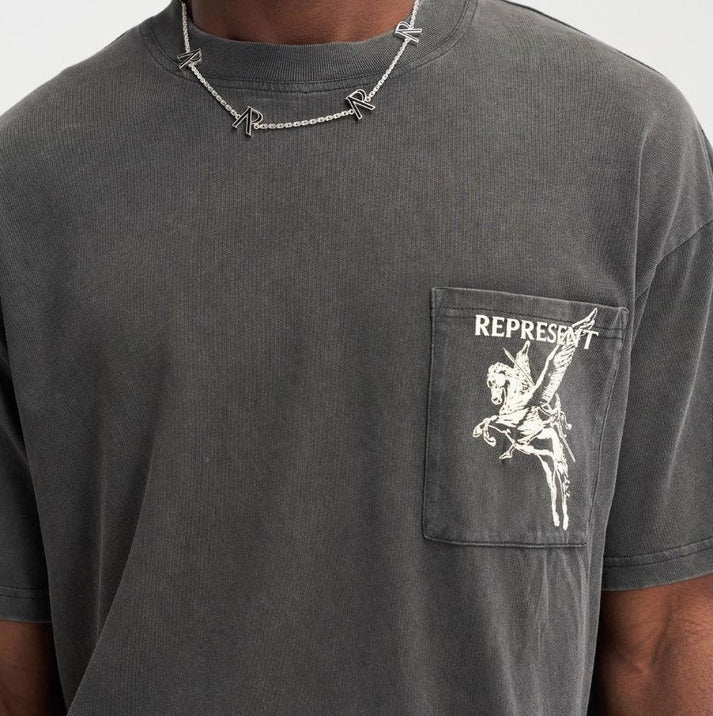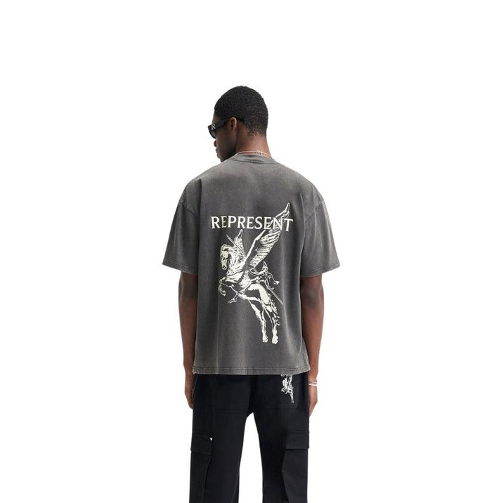 The Represent Mascot Tee in Vintage Grey stands out with its faded wash and bold mascot graphic. Crafted from heavyweight cotton, it merges comfort with a raw aesthetic. Dropped shoulders and an oversized fit give it a contemporary silhouette. A perfect blend of vintage tone and modern edge.