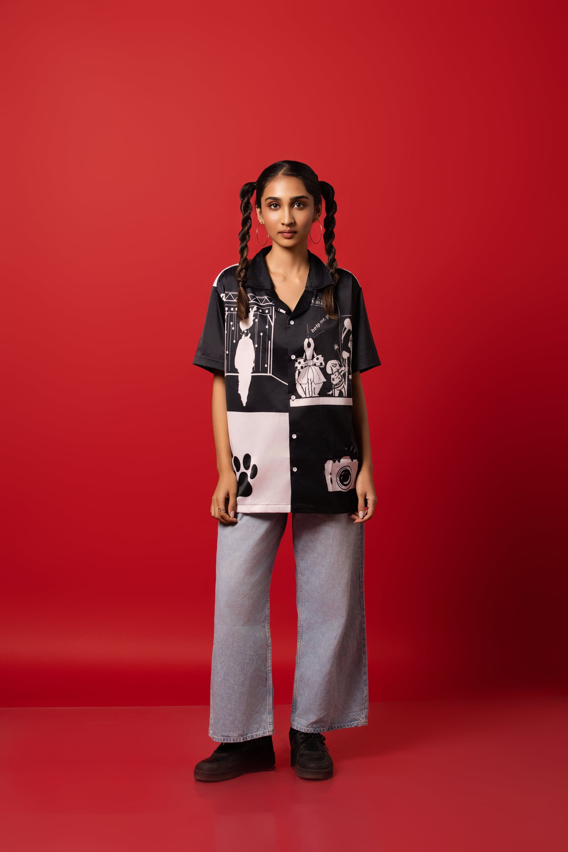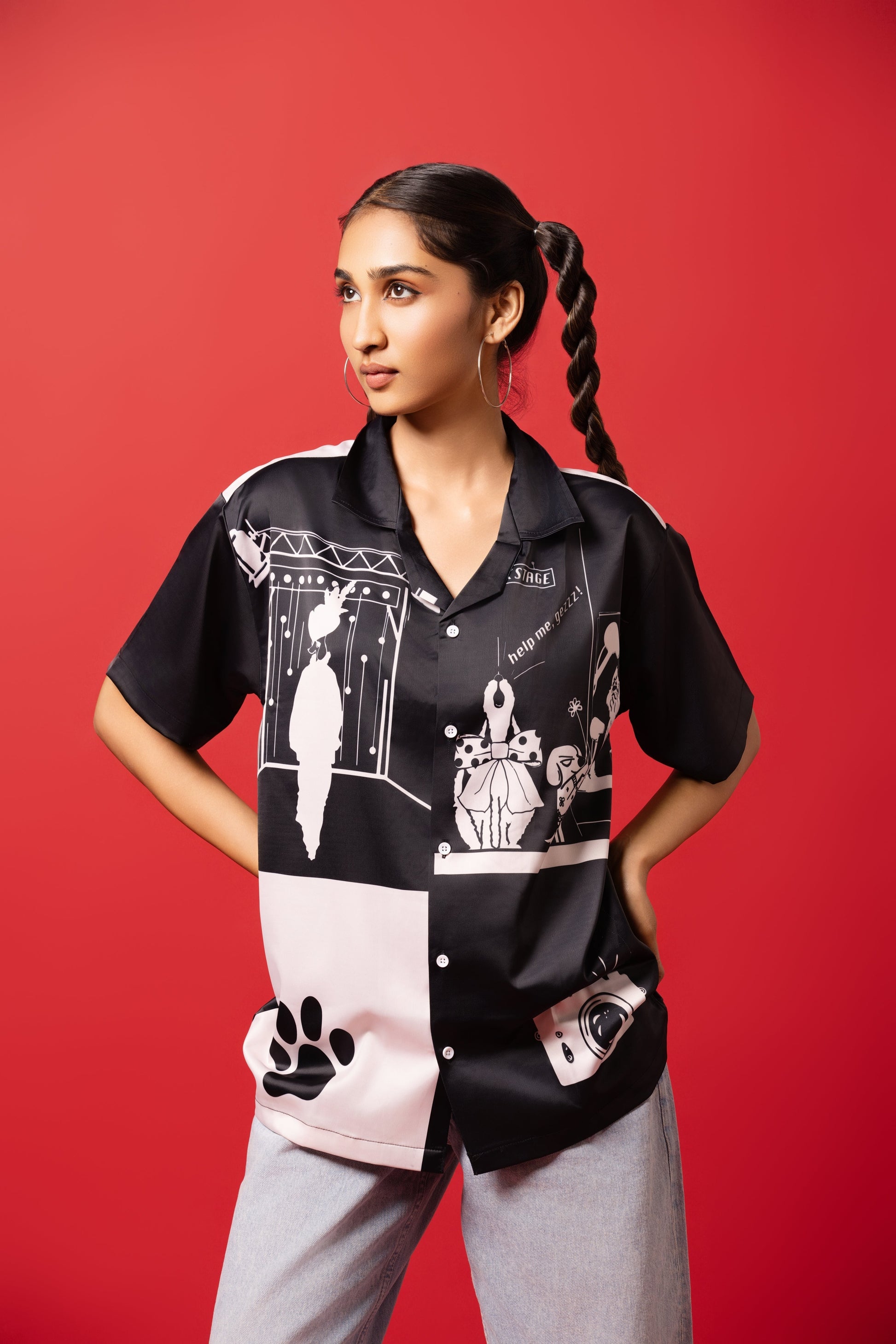 Step into the spotlight with our Runway Brawl Shirt—inspired by the buzz and creative energy behind the scenes. Crafted in silk satin with a fluid button-down cut and finished with a bold sublimation print.