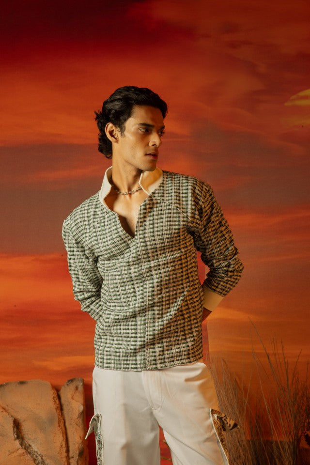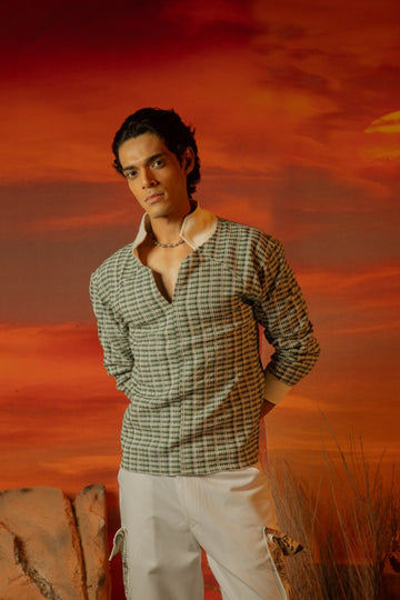 Elevate your wardrobe with this stylish twill shirt, featuring a unique knitted-style collar in subtle green shades for a touch of modern sophistication. Crafted in a full-sleeve, straight-fit silhouette, the shirt offers both comfort and clean lines. The all-over twill-printed effect adds texture and depth, making it a standout piece for casual and smart-casual settings alike.