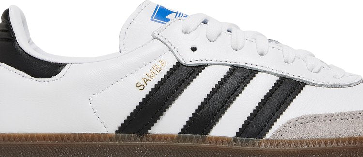 A faithful reissue of an iconic style, the adidas Samba OG retains vintage design lines in a contemporary look for a modern lifestyle. This 'Cloud White' variant is built with a full-grain leather upper complemented by suede at the T-toe, serrated Three-Stripes and a contrast heel panel. Bluebird and foil logos authenticate the retro feel. This low-top is completed with a multi-directional tread pattern on the gum rubber outsole.