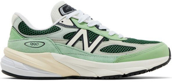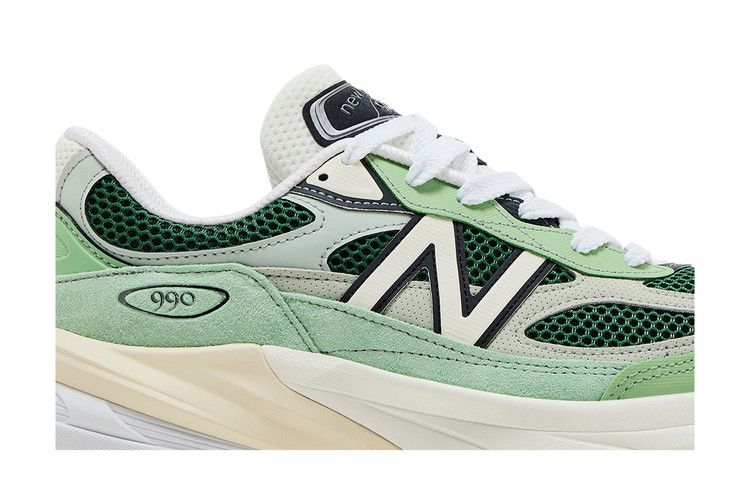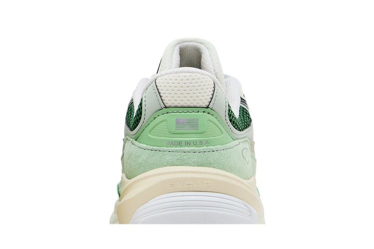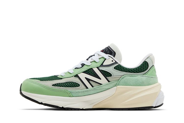 The New Balance 990v6 Made in USA 'Avocado Natural Mint' features open-cell mesh in a dark emerald hue. Mint green suede is utilized on the eyestay and mudguard, while a more subdued shade of green distinguishes synthetic leather overlays that reinforce the midfoot. Branding elements include a cropped 'N' logo and 'Made in USA' stamped on the TPU heel tab. Anchoring the sneaker is an ENCAP midsole, built with FuelCell foam and a polyurethane rim.
