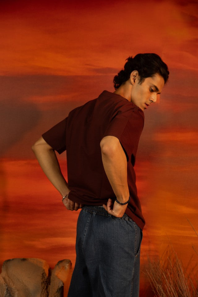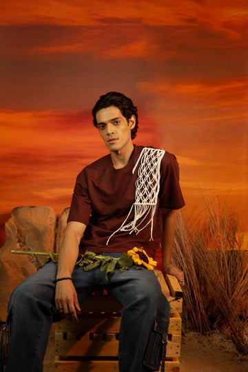 This relaxed-fit t-shirt is cut in breathable fabric with a soft, lived-in hand feel. A single macramé patch sits on one shoulder—a tactile interruption that turns simplicity into statement. Each knot is placed with care, blending craftsmanship and calm.