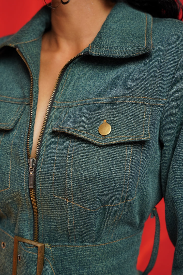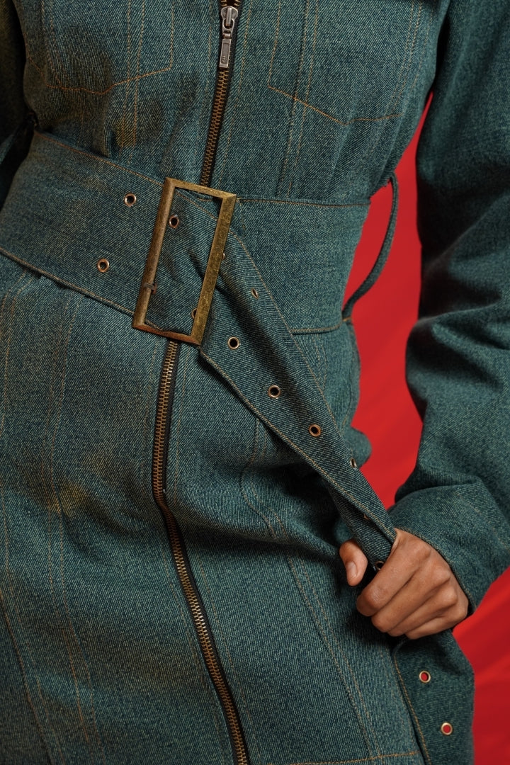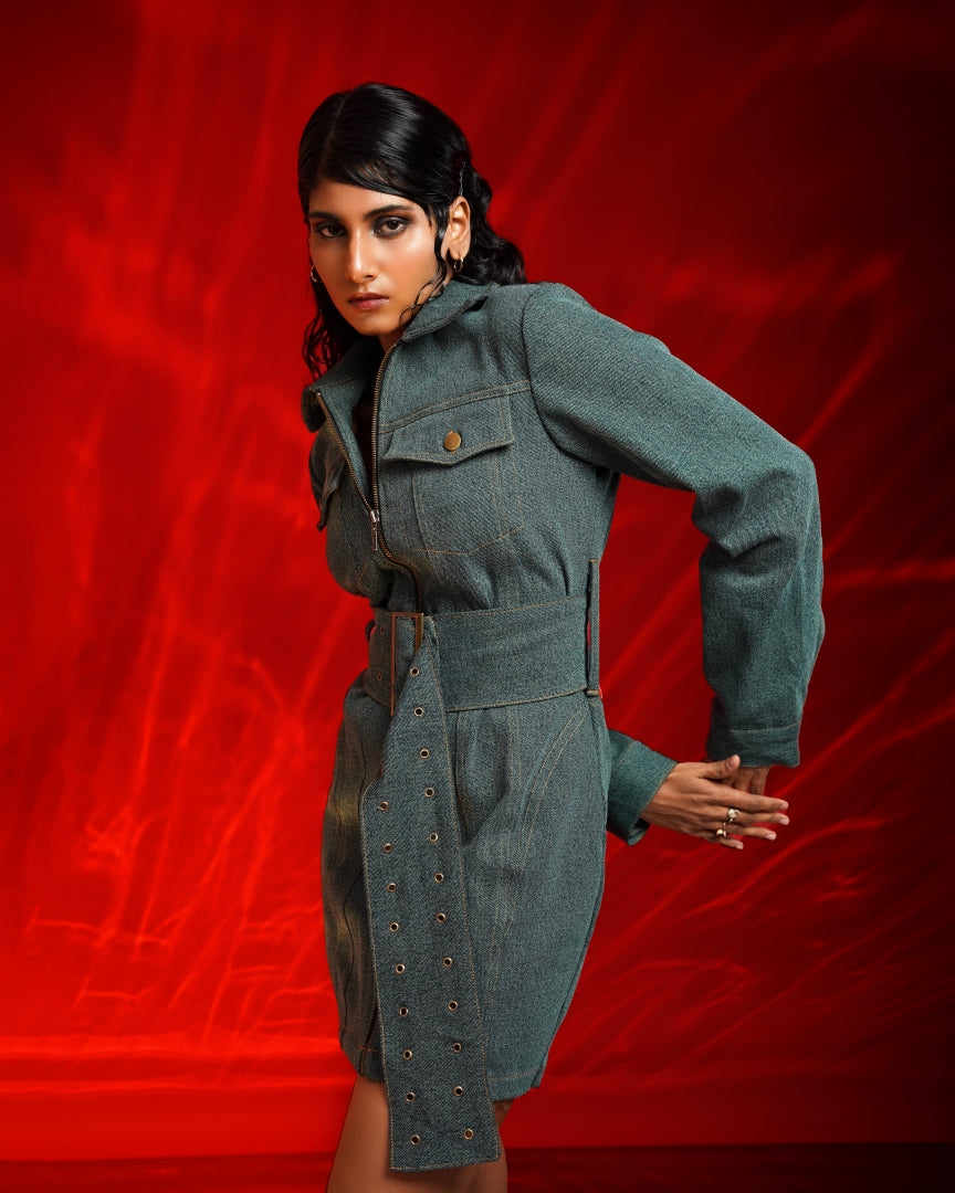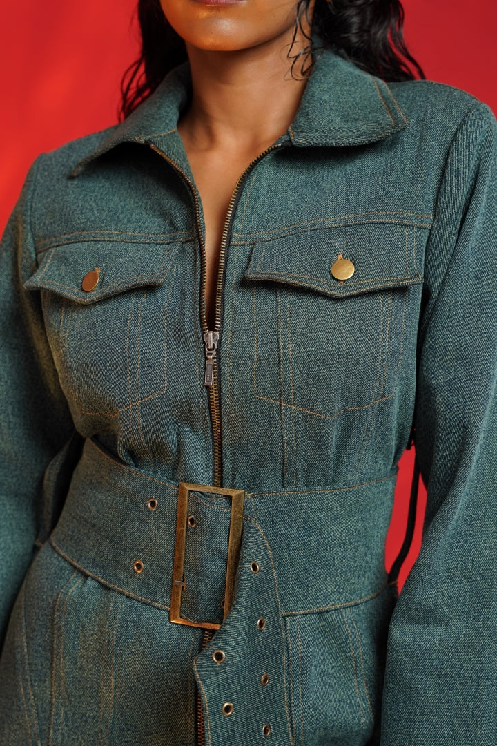 Discover our full-sleeve fitted denim dress, designed to flatter and make a statement. This above-the-knee dress features stylish seams and contrast stitching, adding a chic touch to its practical design. With a functional zipper, two front chest pockets, and a collar with a tie-up belt at the waist, it effortlessly combines style and comfort. The huge buckle at the front and waist loops at the side seams complete the look, making it perfect for any occasion.
