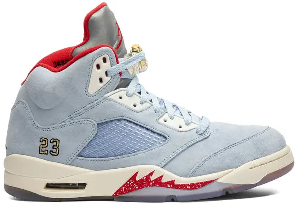 The Trophy Room x Air Jordan 5 Retro sneaker draws inspiration from the real-life trophy room in the Jordan family home. This 'Ice Blue' rendition is replete with a rich suede upper, hits of University Red, Sail and a metallic gold lace lock. Each lateral heel is embroidered with metallic gold numerals—'23' and '5'—the jersey numbers worn by MJ and his son, Marcus. Below, the sneaker's translucent rubber sole displays a wood-grain motif to reference the court-style flooring in MJ's trophy room. A total of 7,000 pairs were released in May 2019, each individually numbered.