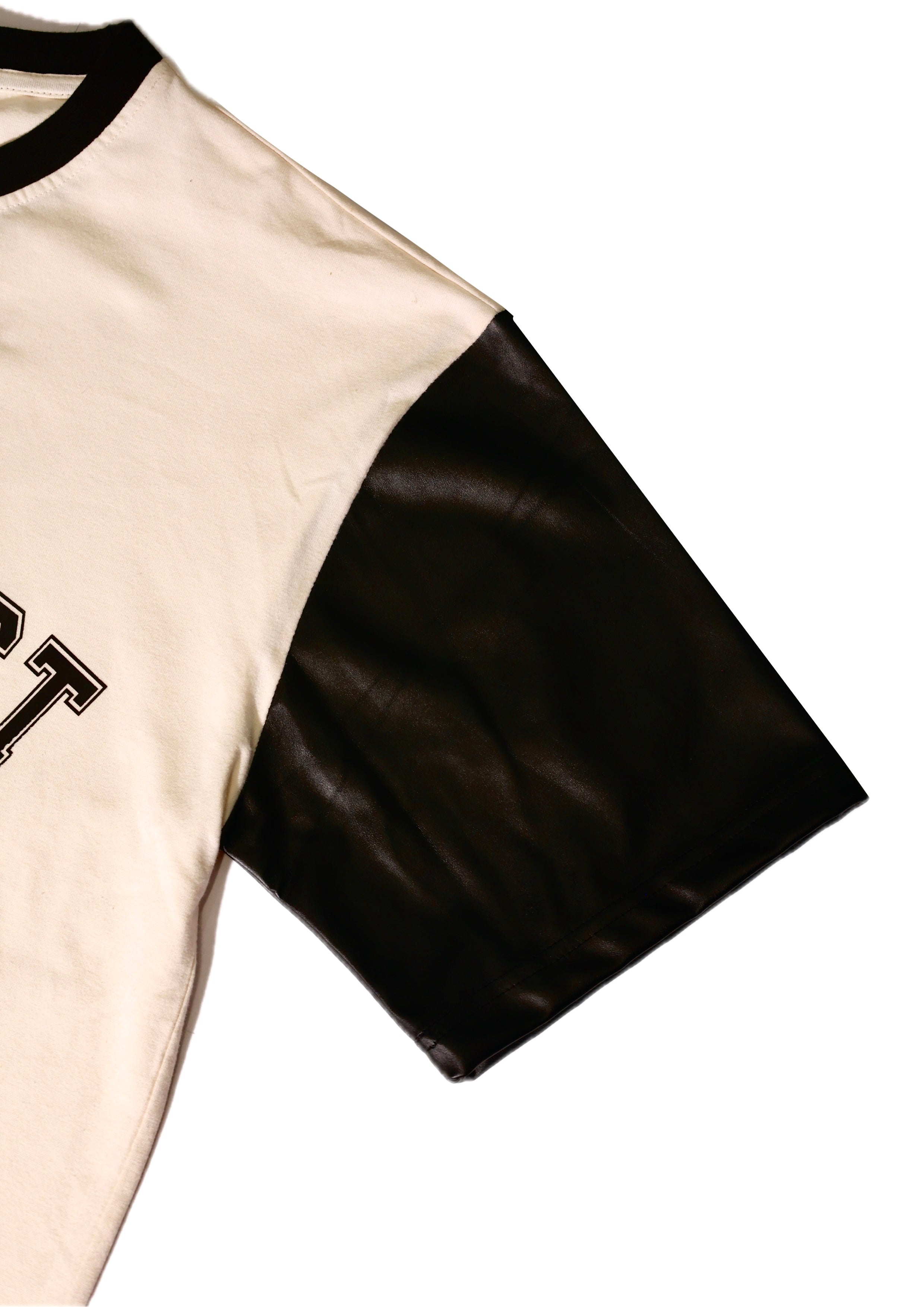 Style - Oversized tshirt. sleek PU leather sleeves, offering a bold contrast and a modern, edgy look.