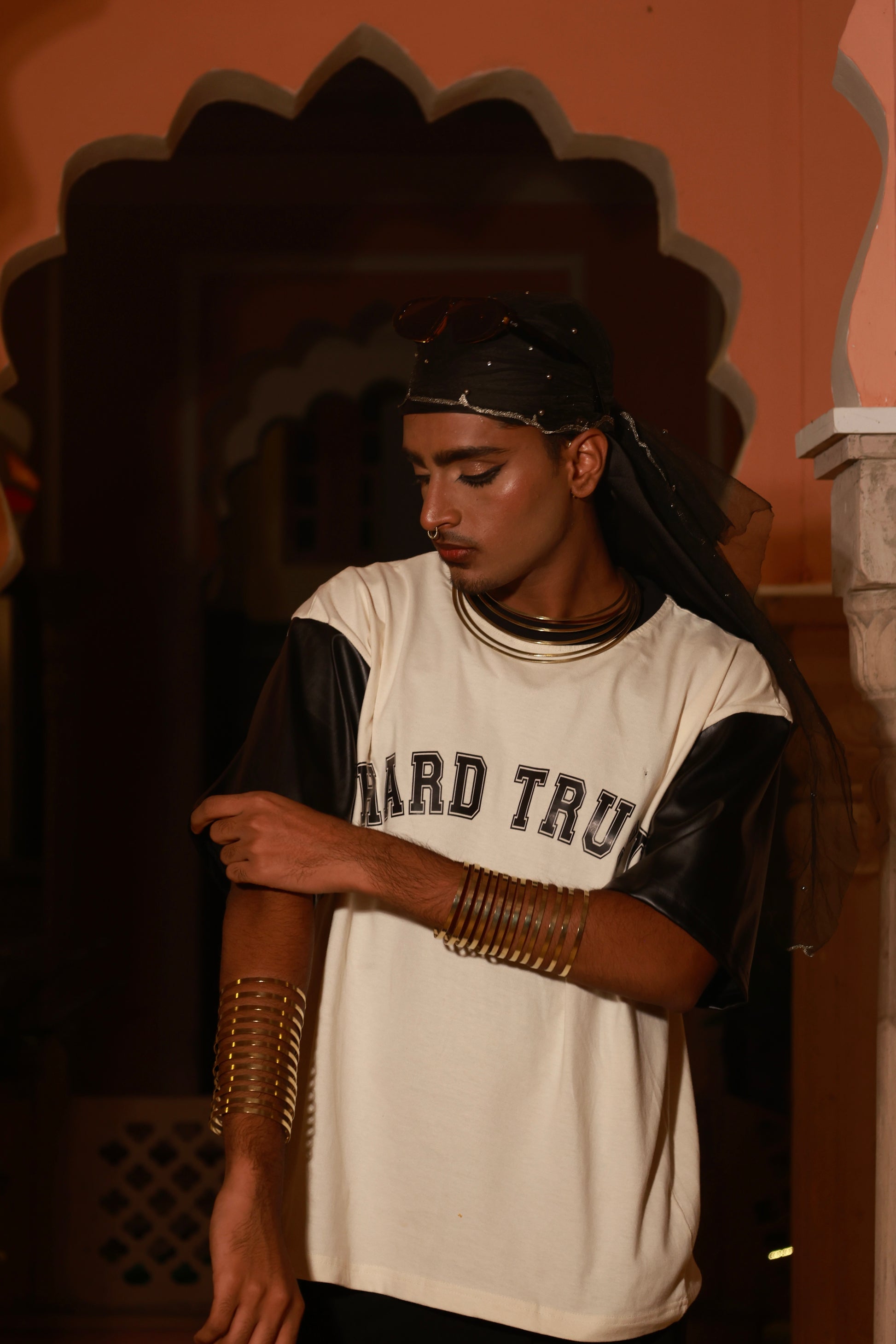 Fabrication - 240 GSM tshirt with Pu leather combination.
