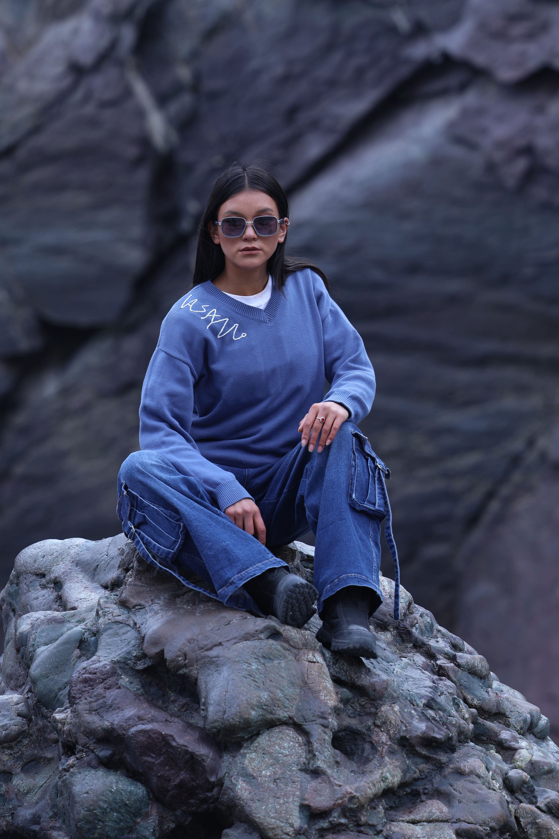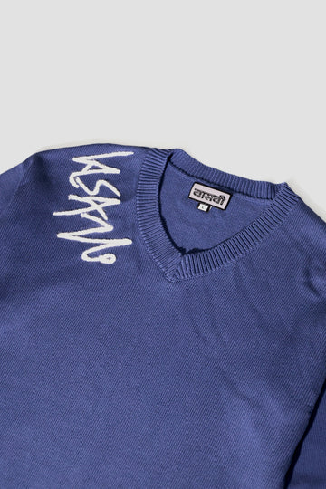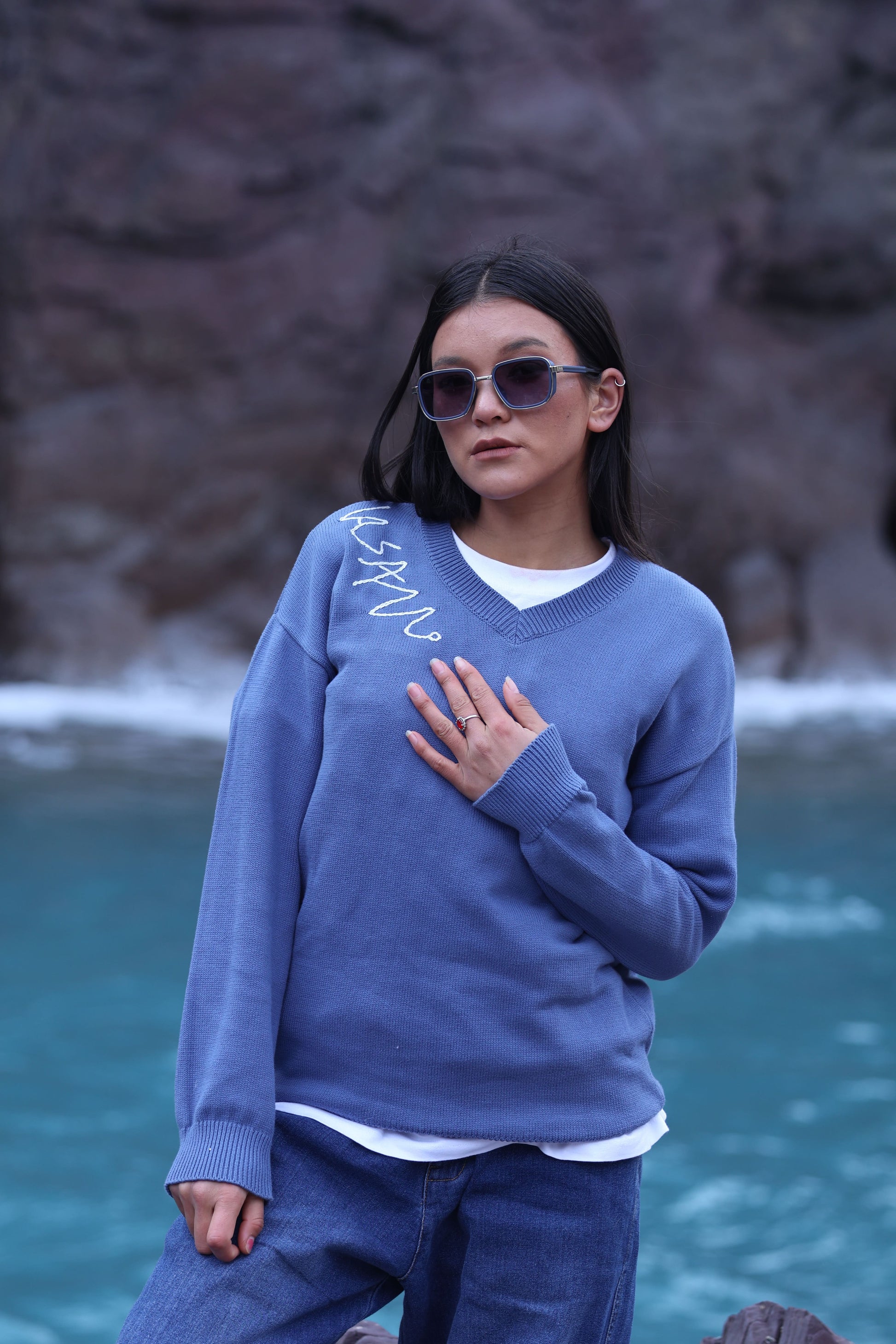 In the rugged beauty of Ladakh, this V-neck knitted sweater with handcrafted brand logo embroidery reflects timeless craftsmanship and modern style. The serene landscape complements its perfect blend of warmth and elegance, offering both comfort and sophistication.