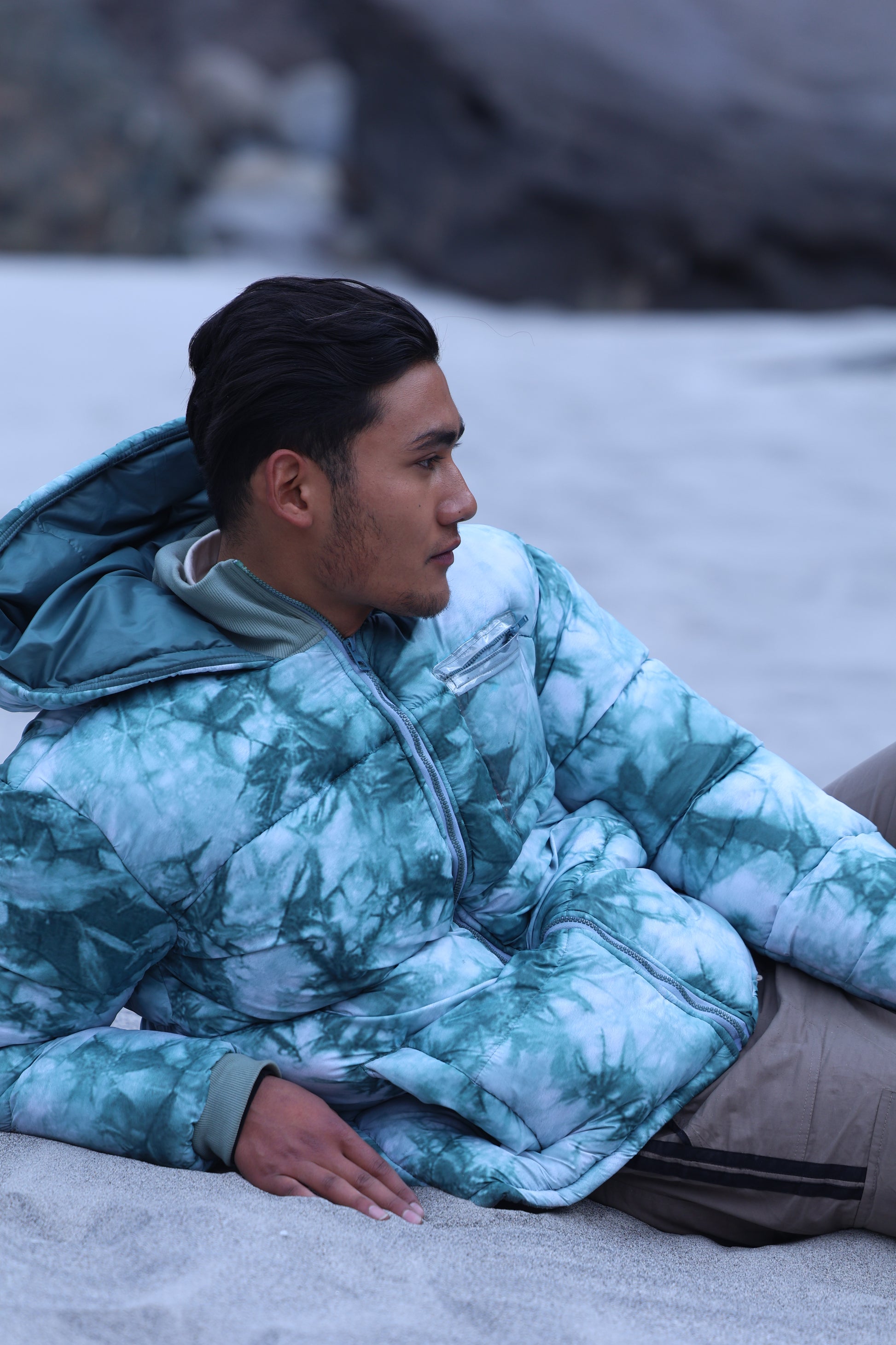 Fabrication - Poly-fabric with tie-dye print having comfortable lining. Extended turtleneck with rib fabric.