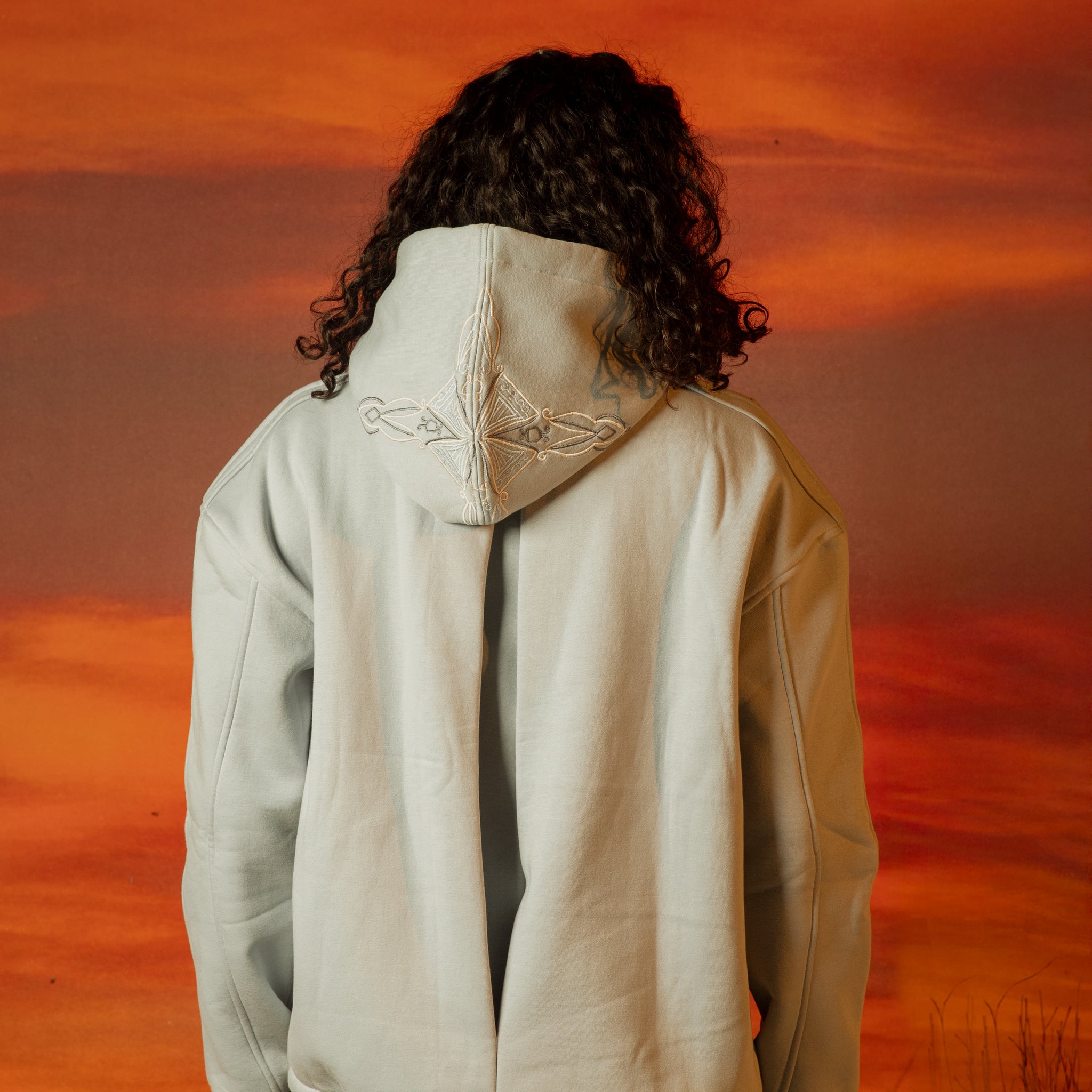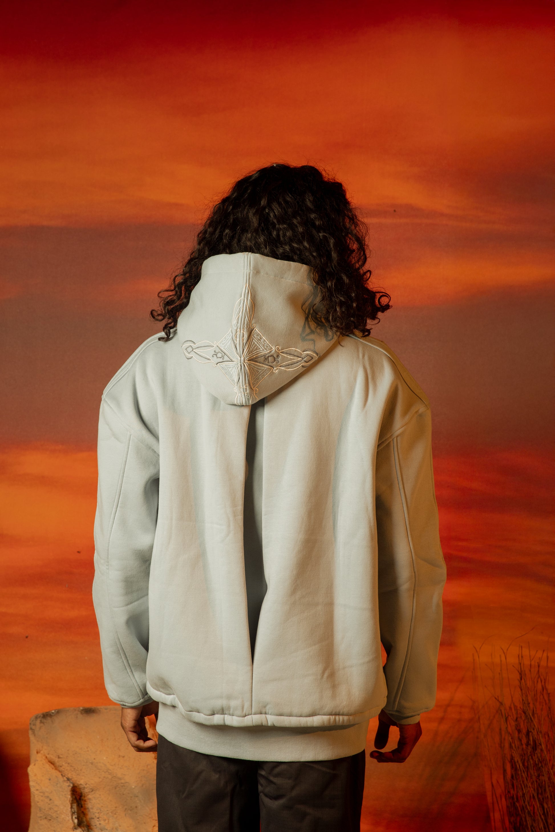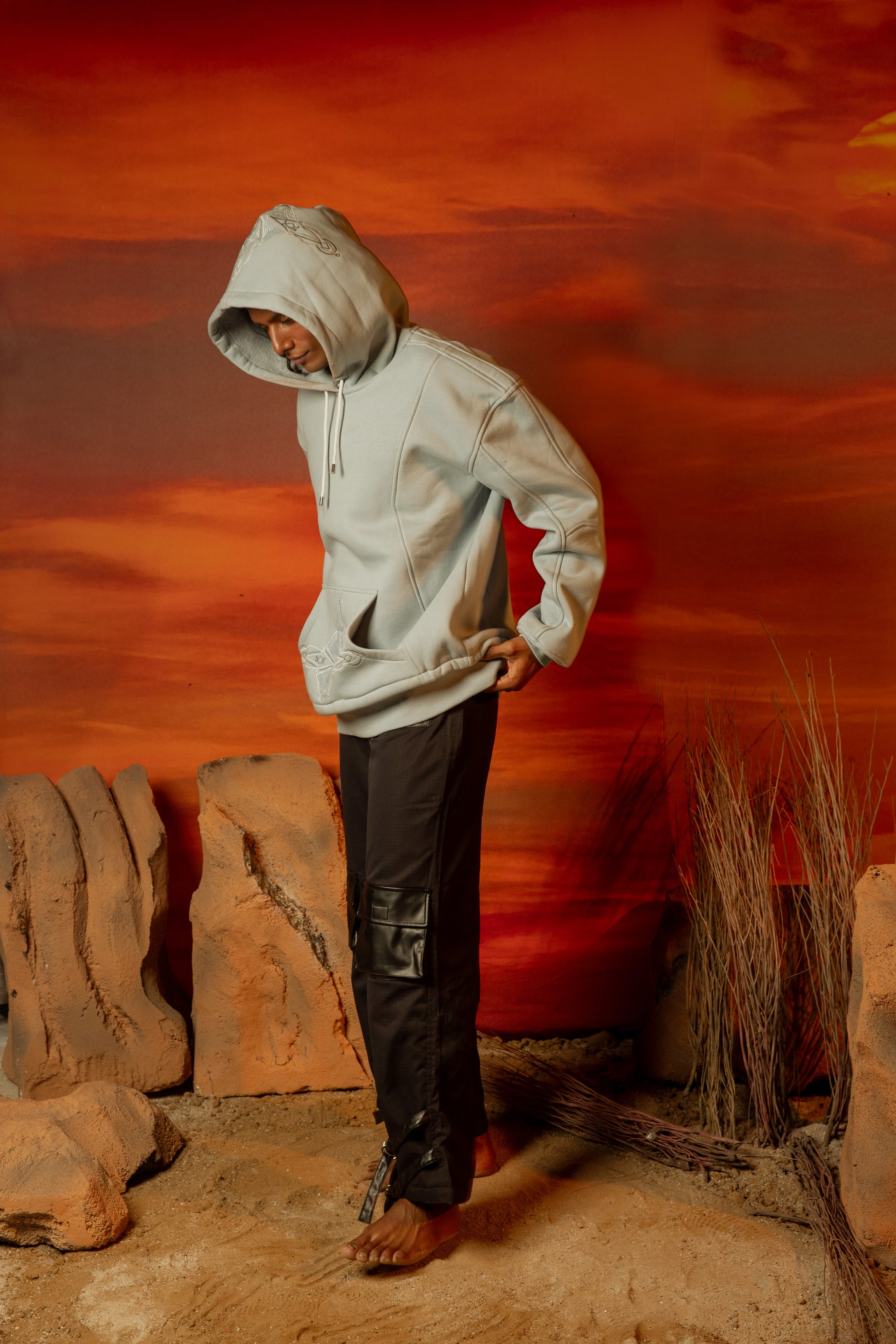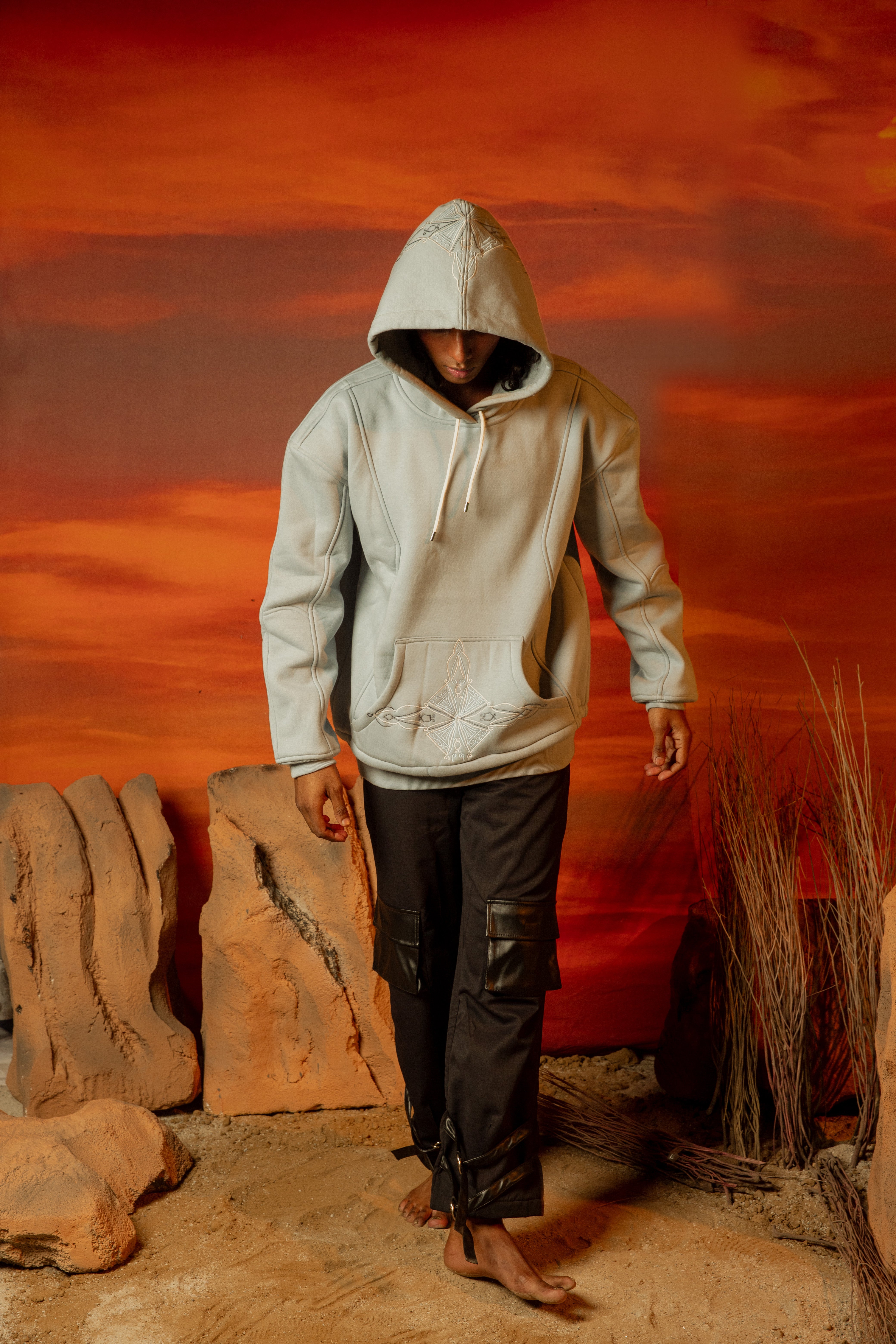 This oversized hoodie is constructed from heavyweight fleece with a soft, structured fall. Along the hood and front pouch, you’ll find ornamental threadwork—inspired by the wrought iron railings of old Goan balconies and colonial staircases. The embroidery isn’t loud—it’s etched like memory—subtle, architectural, and intentionally placed where the body seeks rest: the head, the hands, the hold.
