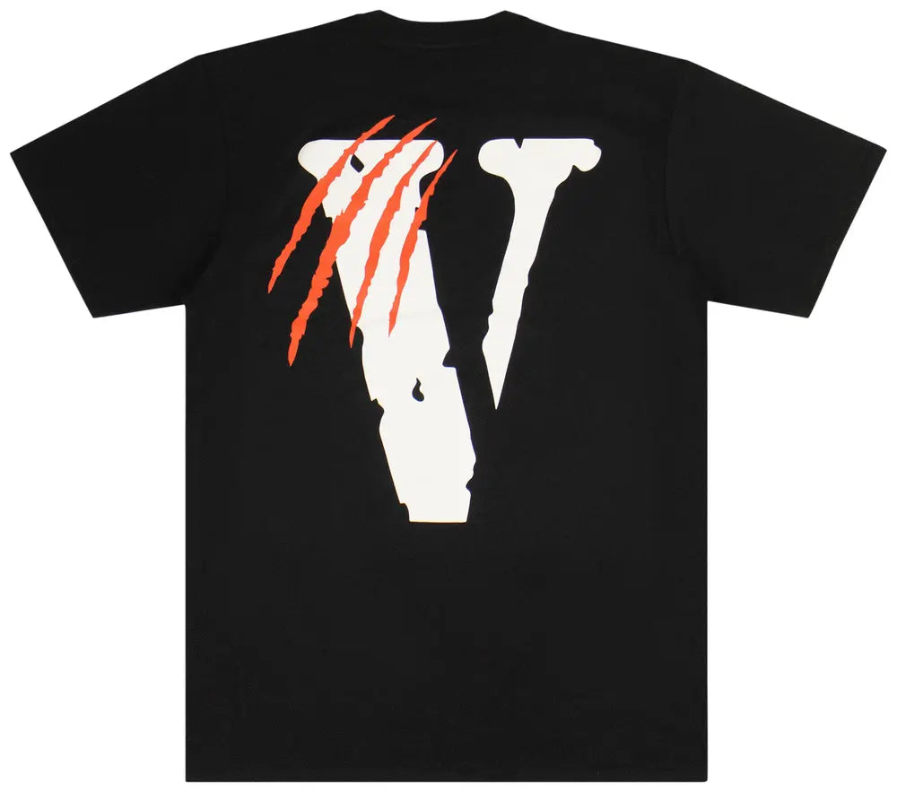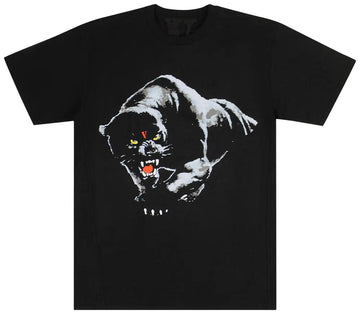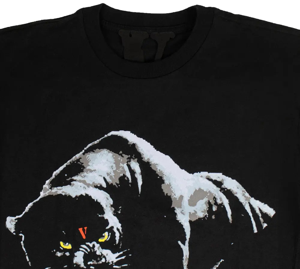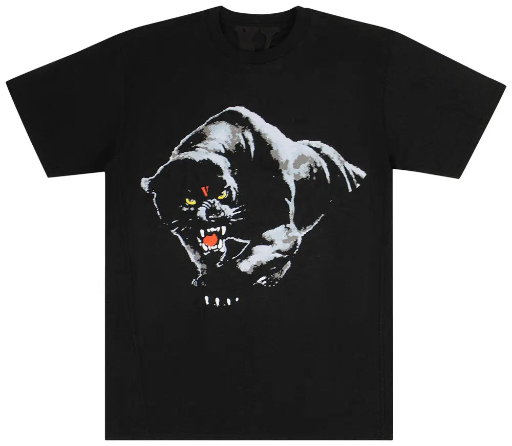 The Vlone Black Panther T-Shirt 'Black' features artwork of a panther emblazoned across the front. The label's "V" emblem appears on the animal's head as well as on the back, detailed with clawmark graphics.