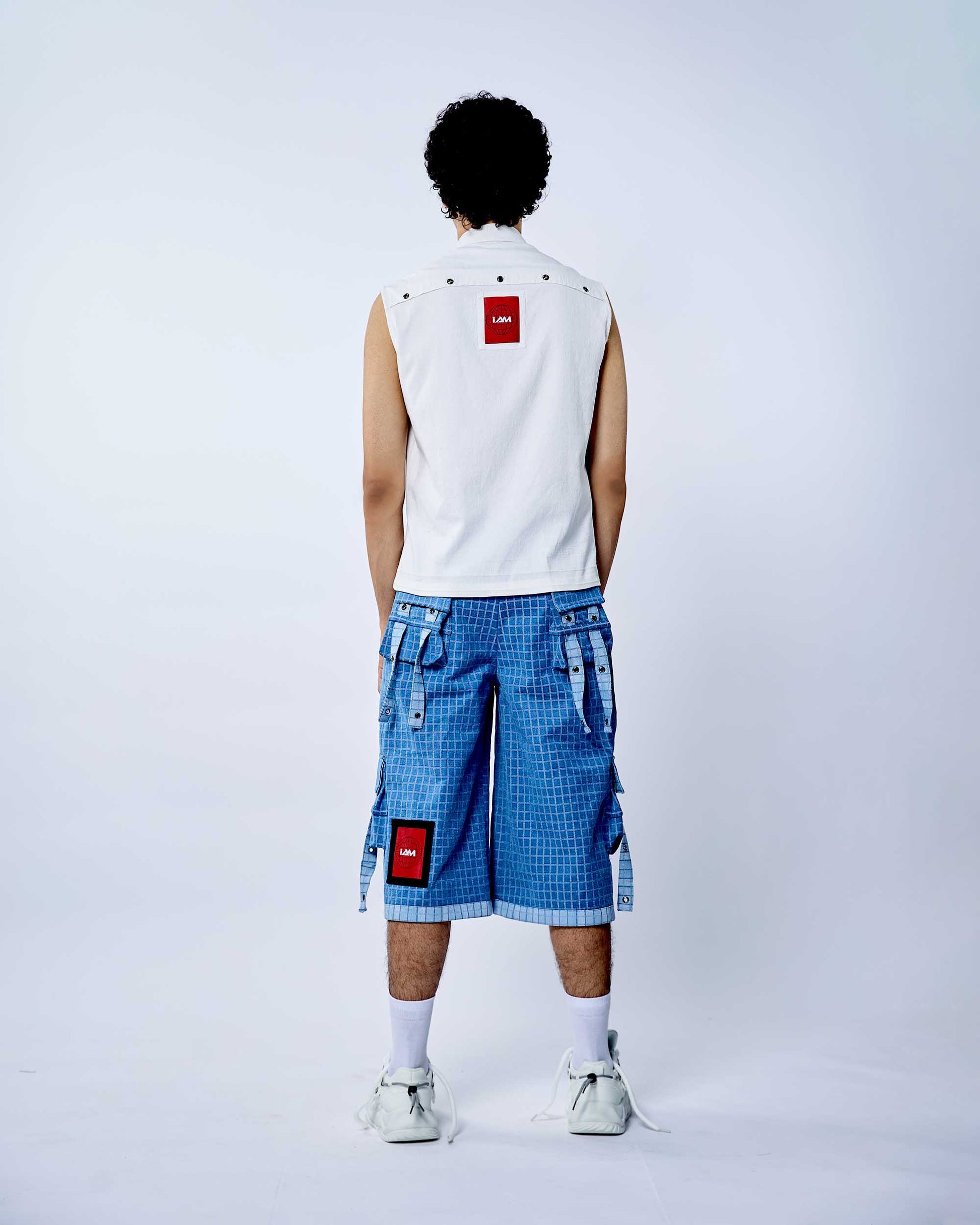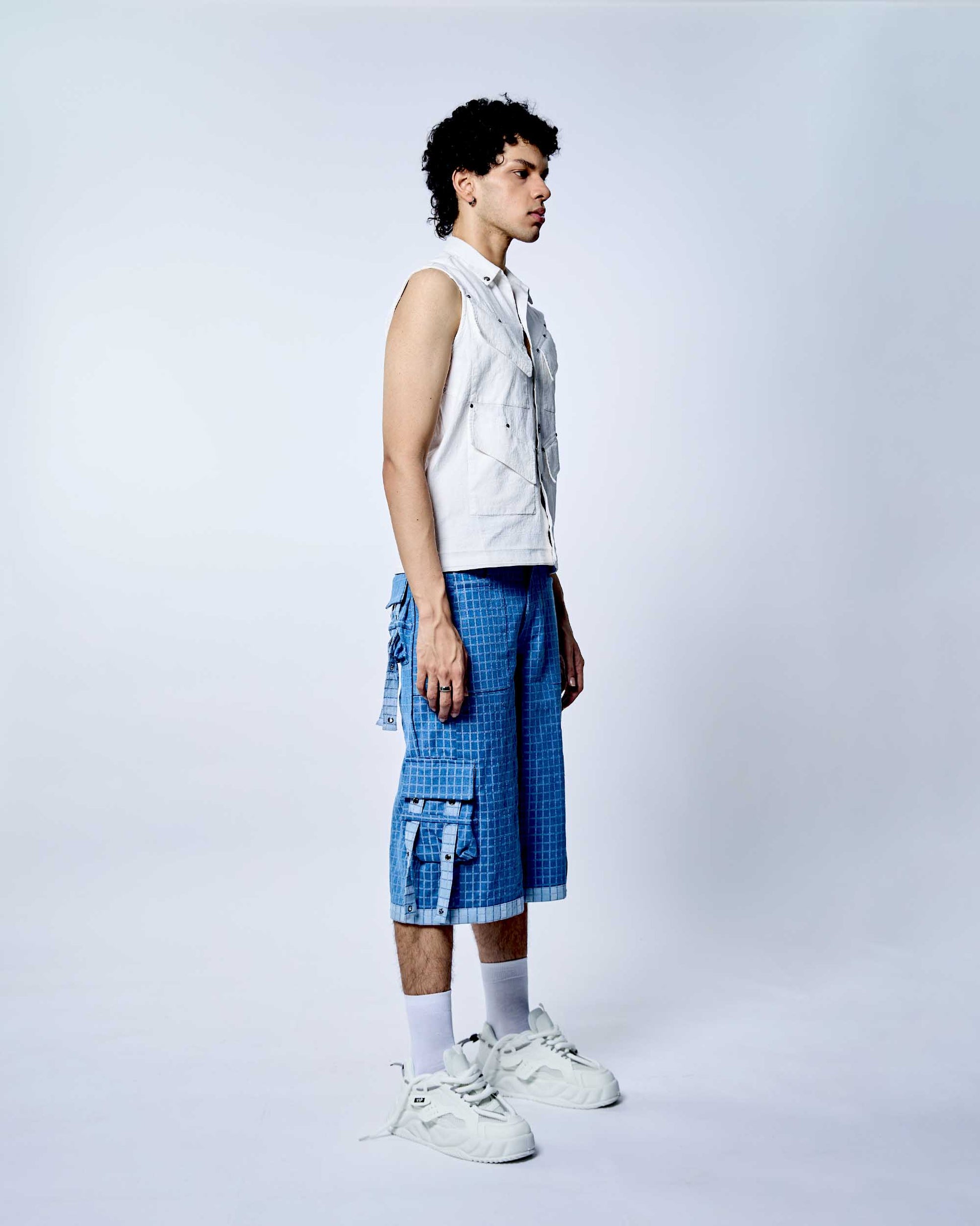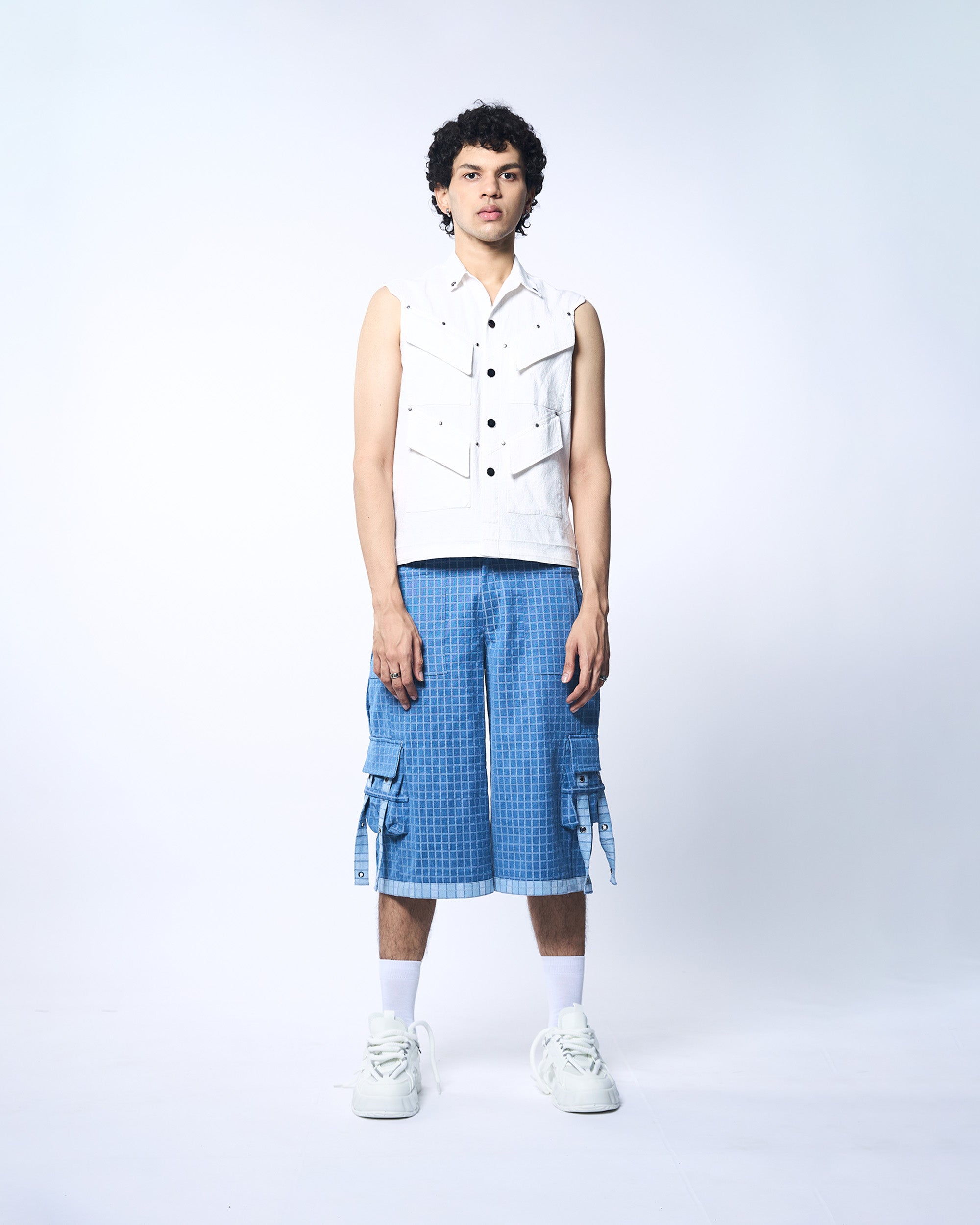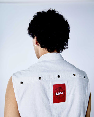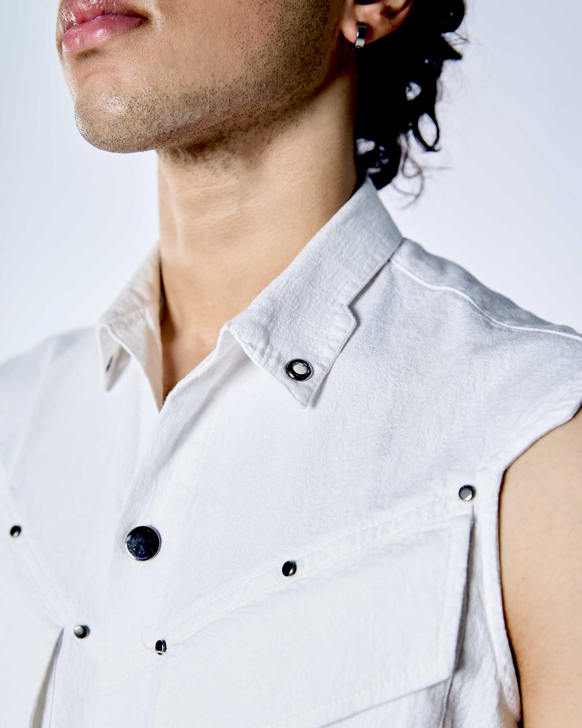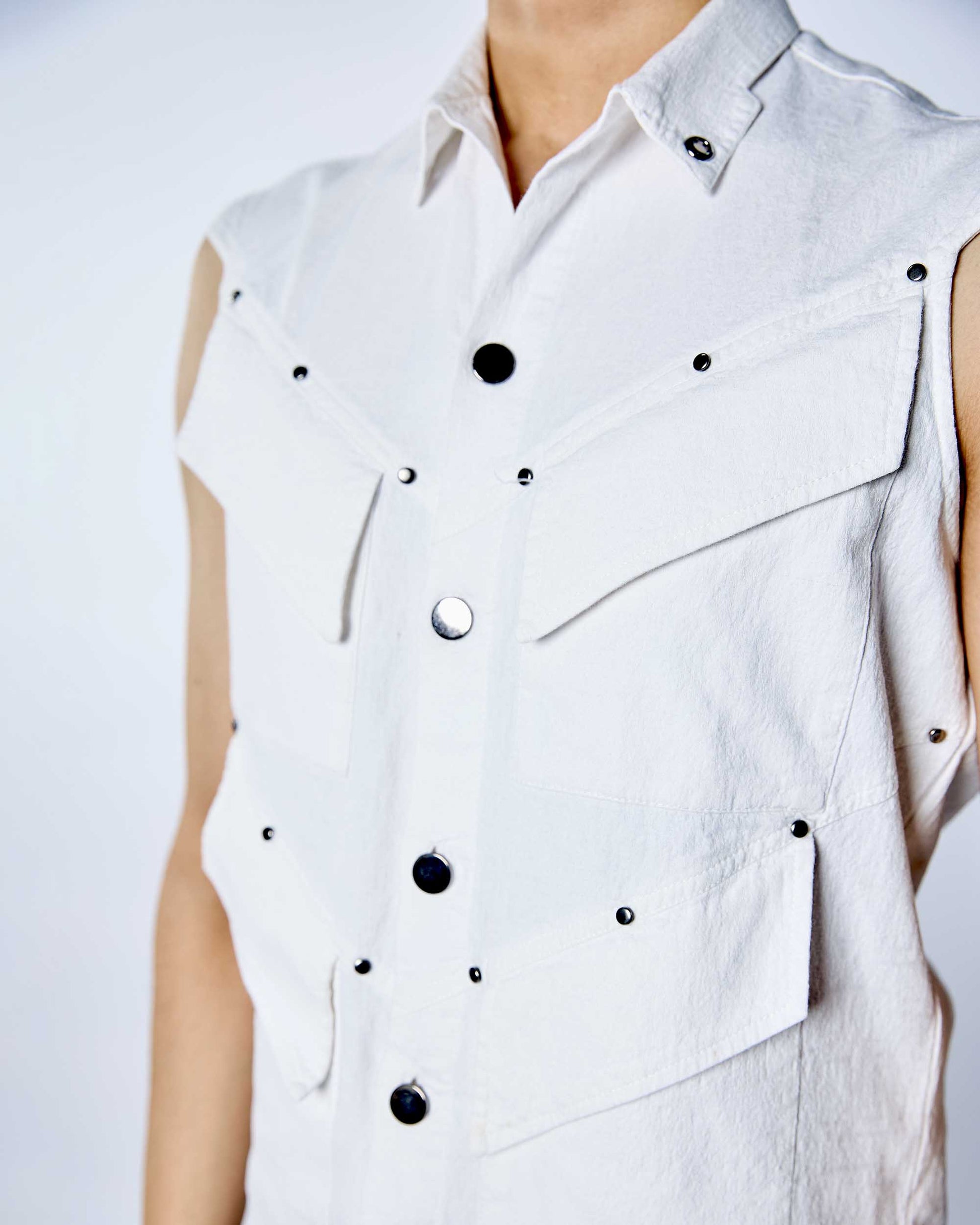 Introducing the White Sleeveless Shirt: a striking design with a unique silhouette featuring a cut collar, sleeves, and bottom. Enhanced by four functional pockets, this piece combines avant-garde style with practicality. Ideal for those who appreciate innovative, versatile fashion and standout elegance.