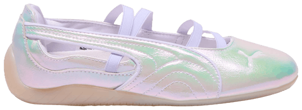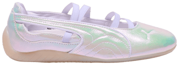 Elevate your style with the Puma Speedcat Ballet 'Pearlized'—a fusion of motorsport heritage and ballet-inspired design. Featuring a shimmering iridescent upper crafted from at least 30% recycled materials, these women's sneakers offer a sleek silhouette, elastic bands for a snug fit, and a low-profile rubber outsole for flexible traction. Perfect for fashion-forward individuals seeking comfort and elegance in every step